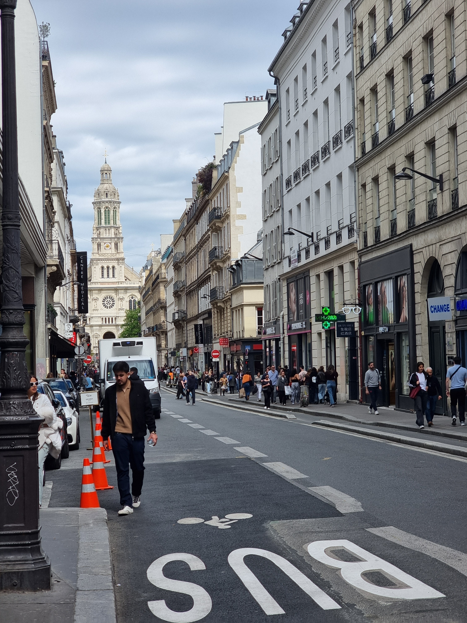 Here's a detailed description of the image: **General Scene:** The image is a street scene in Paris, France, specifically on a street with historical buildings and retail businesses. The photograph…read more
