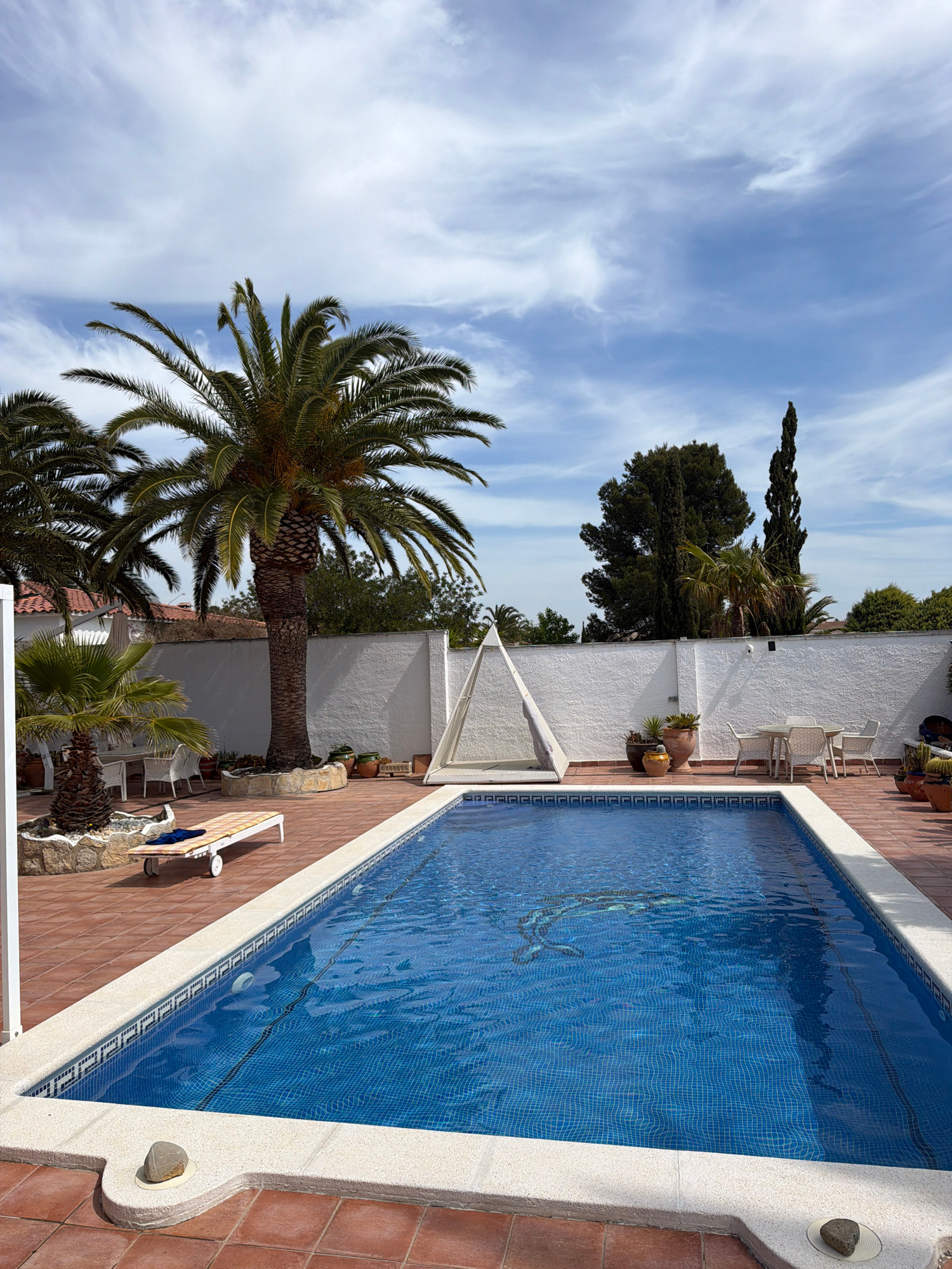 This outdoor scene features a swimming pool with light blue tiles and a white border, situated beside a light-colored building. The pool area is paved with red tiles, with several patio chairs and var…read more