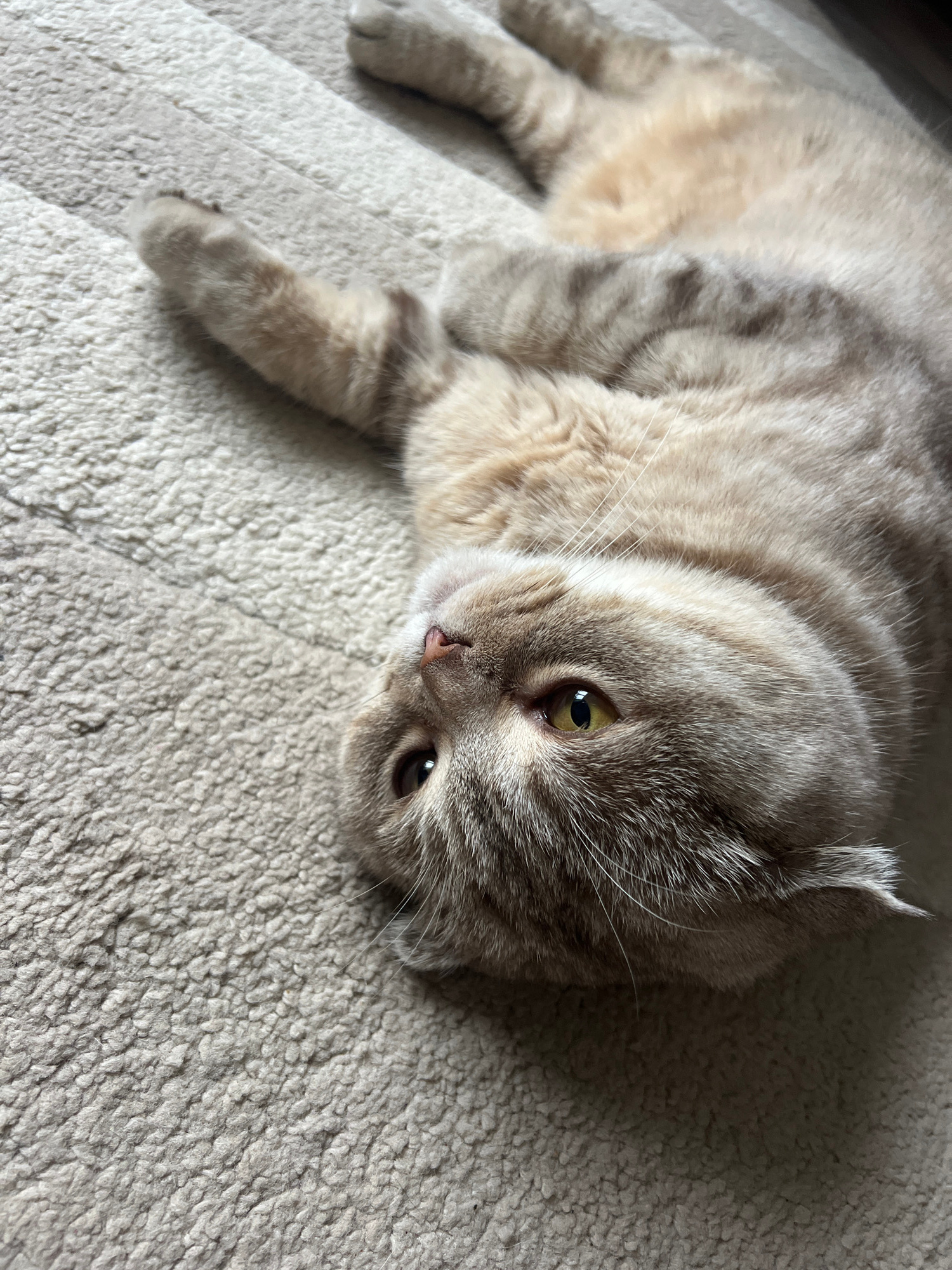 A light-colored cat with prominent tabby stripes is seen in a close-up, horizontal shot, lying relaxed on a textured, light beige or off-white soft surface, likely a blanket or bed. The cat's fur disp…read more