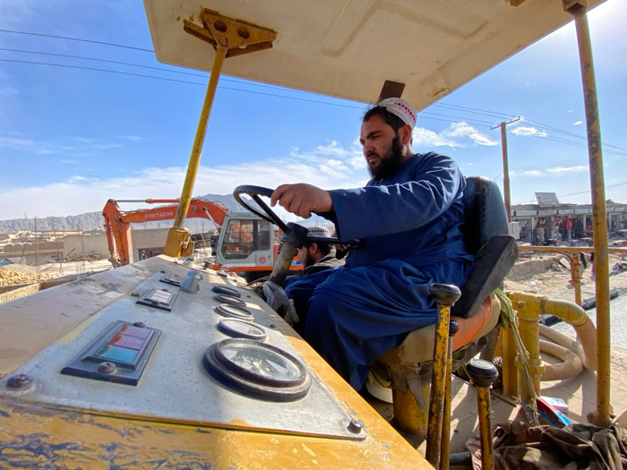 The image depicts a construction scene in Gundigan Village, Afghanistan, under clear daylight. In the immediate foreground and midground, an adult male with a dark beard, wearing a blue shalwar kameez…read more