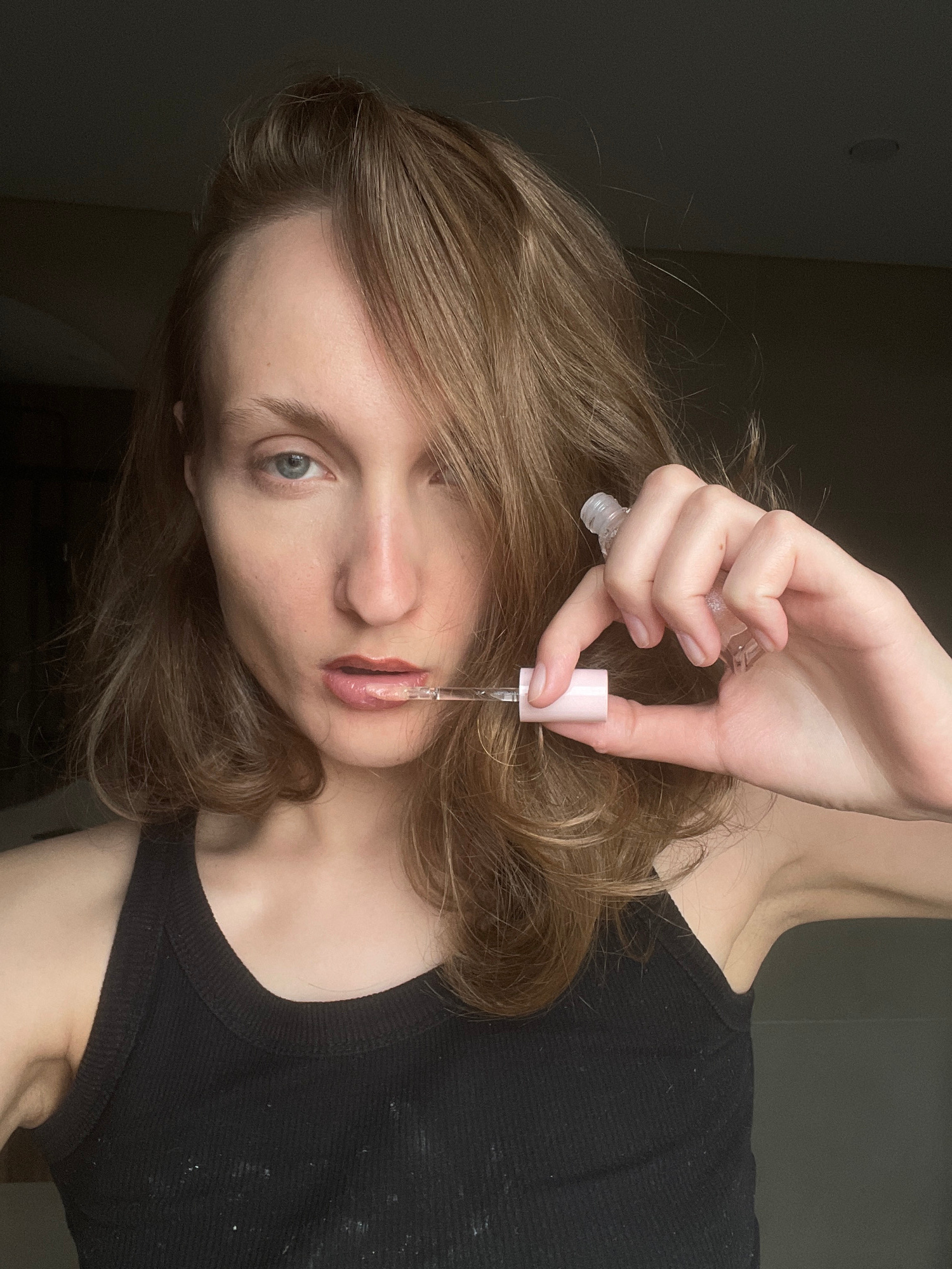 A person with light skin, light brown hair, and blue eyes is holding a dropper filled with a clear liquid, applying it to their lips. The person is wearing a black shirt. The background is a dark, ind…read more
