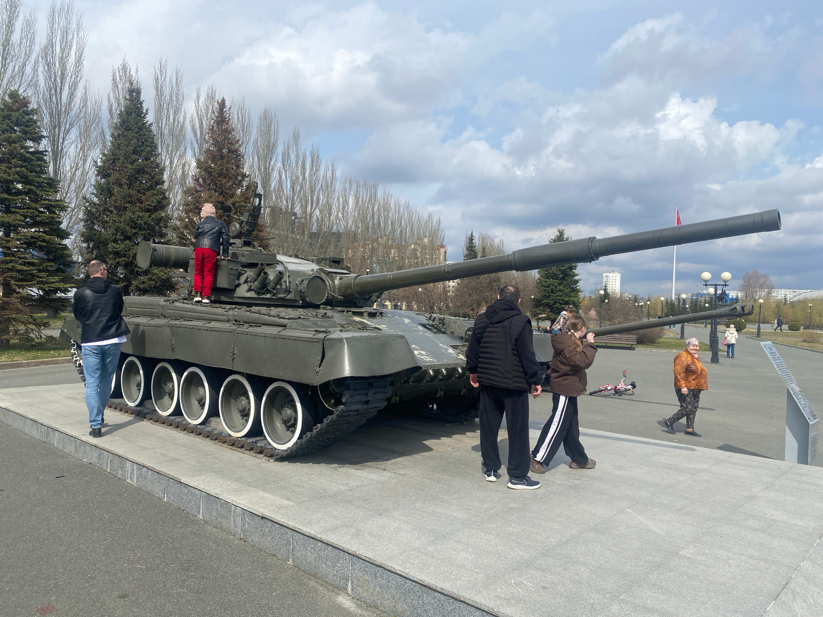 The image displays a large, olive-green main battle tank, likely a T-series, set on a raised grey concrete platform in what appears to be a public park or memorial square in Kazan, Russia. The tank's…read more