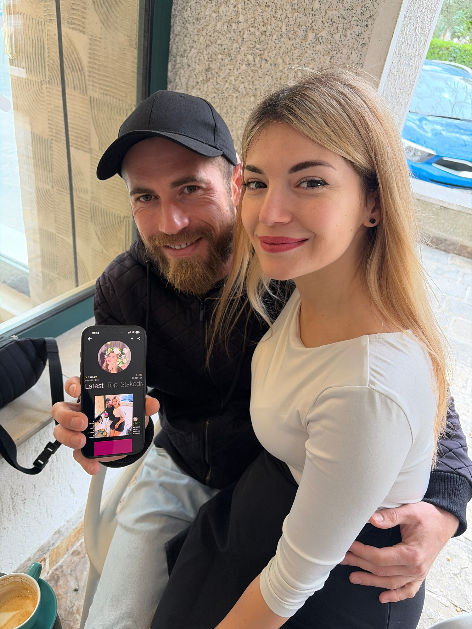 Two people are in the image. A woman with long blonde hair and a white shirt sits behind a man in a black cap and jacket. The man holds a smartphone in his hand, displaying an image that includes the…read more