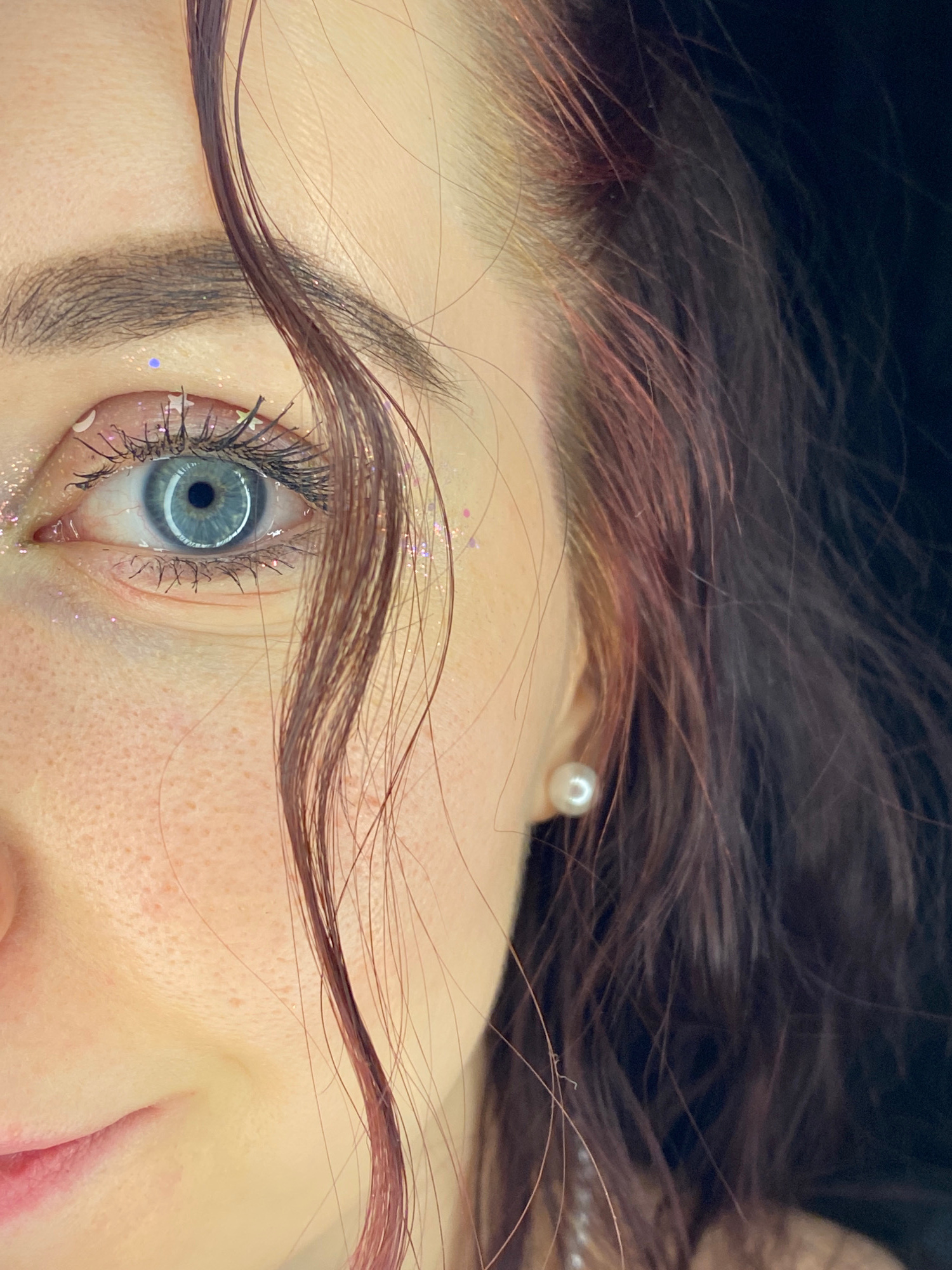The image is a close-up shot of a person's face, focusing on the eye and surrounding area. The person has fair skin, brown hair with reddish tints, and a blue eye. There is glitter or small decorative…read more