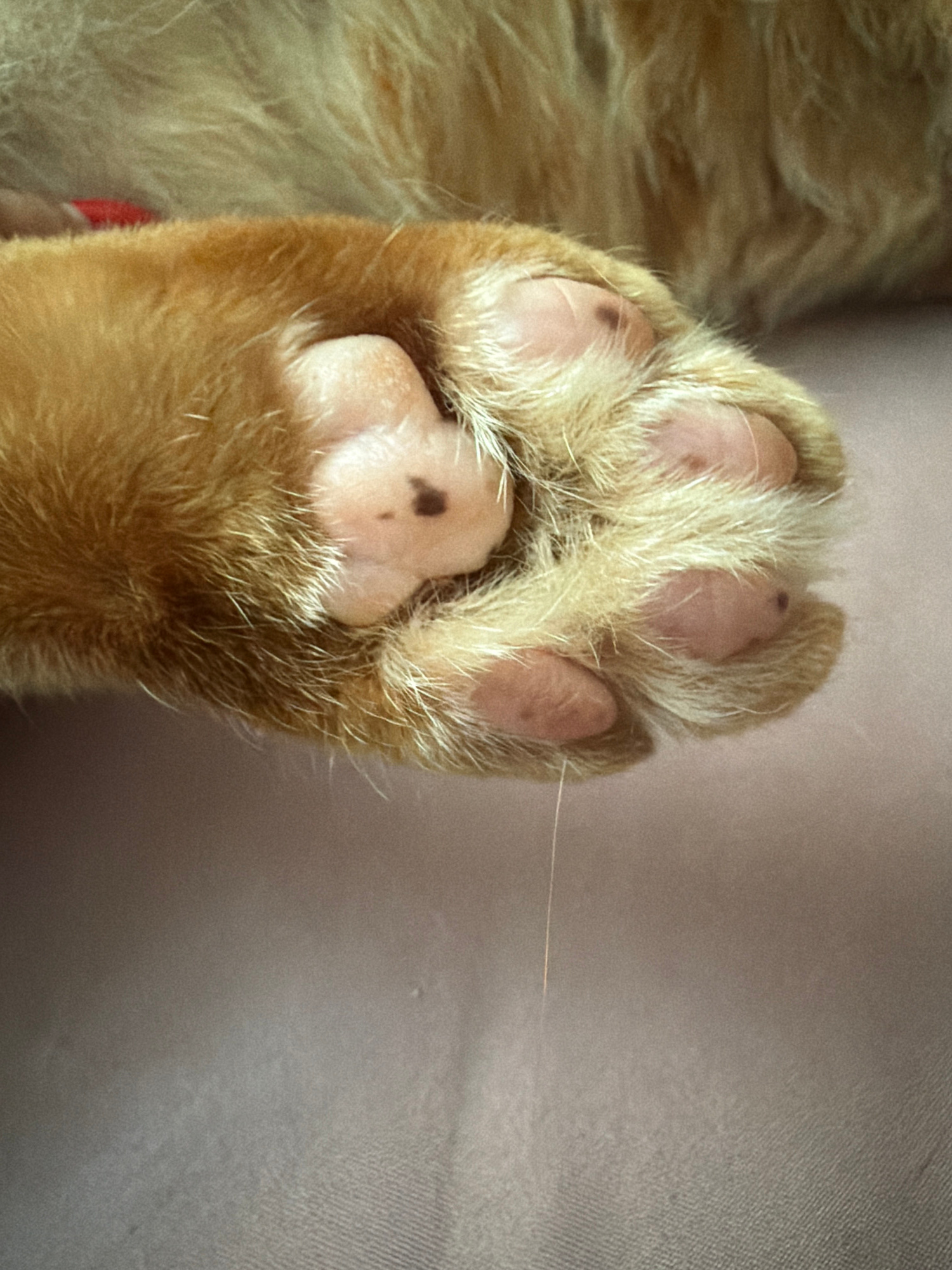 The image shows a close-up of a cat's paw. The paw is orange and furry, with pink paw pads. There are small dark spots on one of the pads. A single strand of light-colored hair is visible near the top…read more