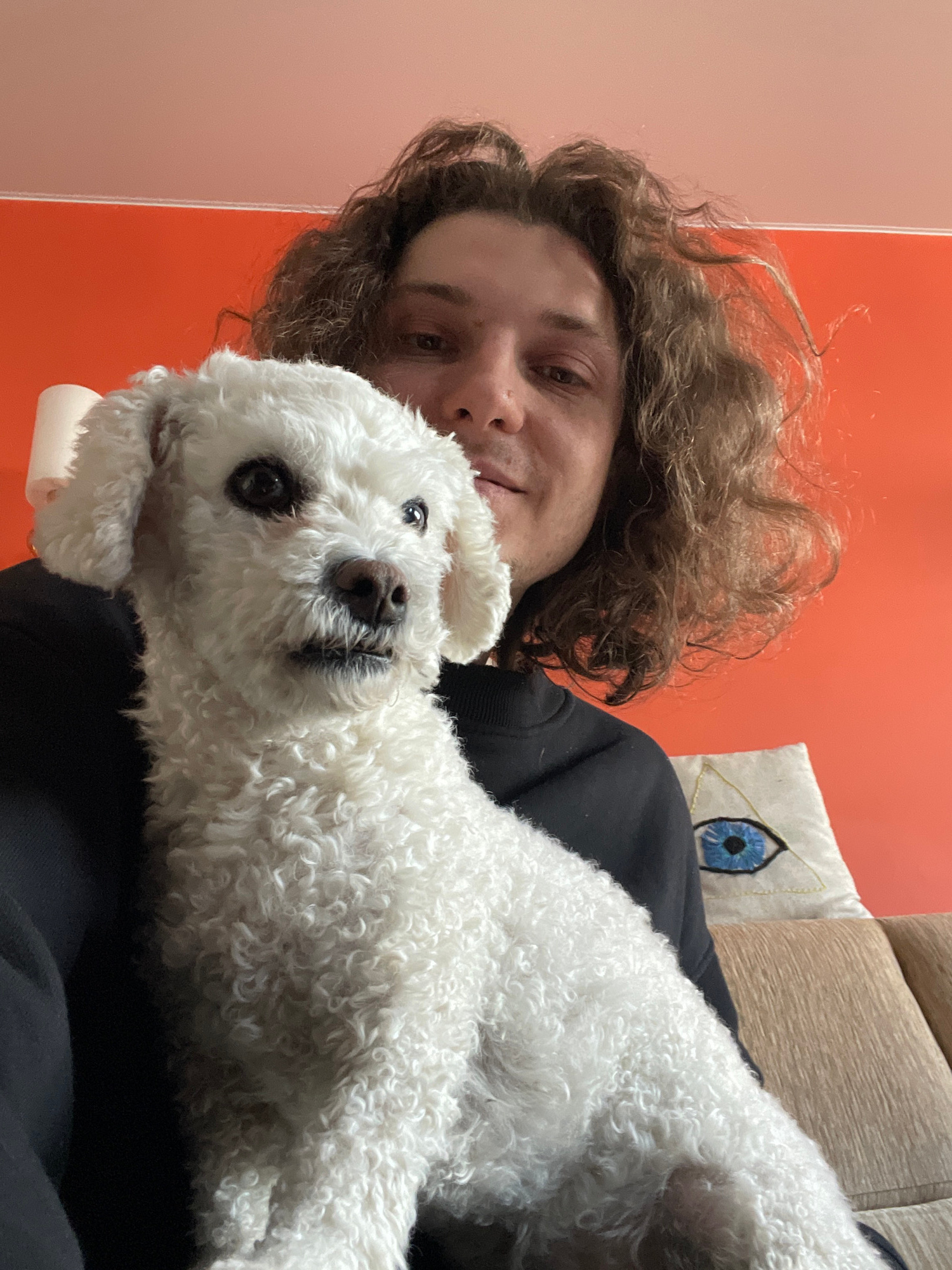 A person with curly brown hair is holding a white Bichon Frise dog. The person is wearing a black hoodie. The background includes an orange wall and a beige pillow with an embroidered blue eye. The lo…read more