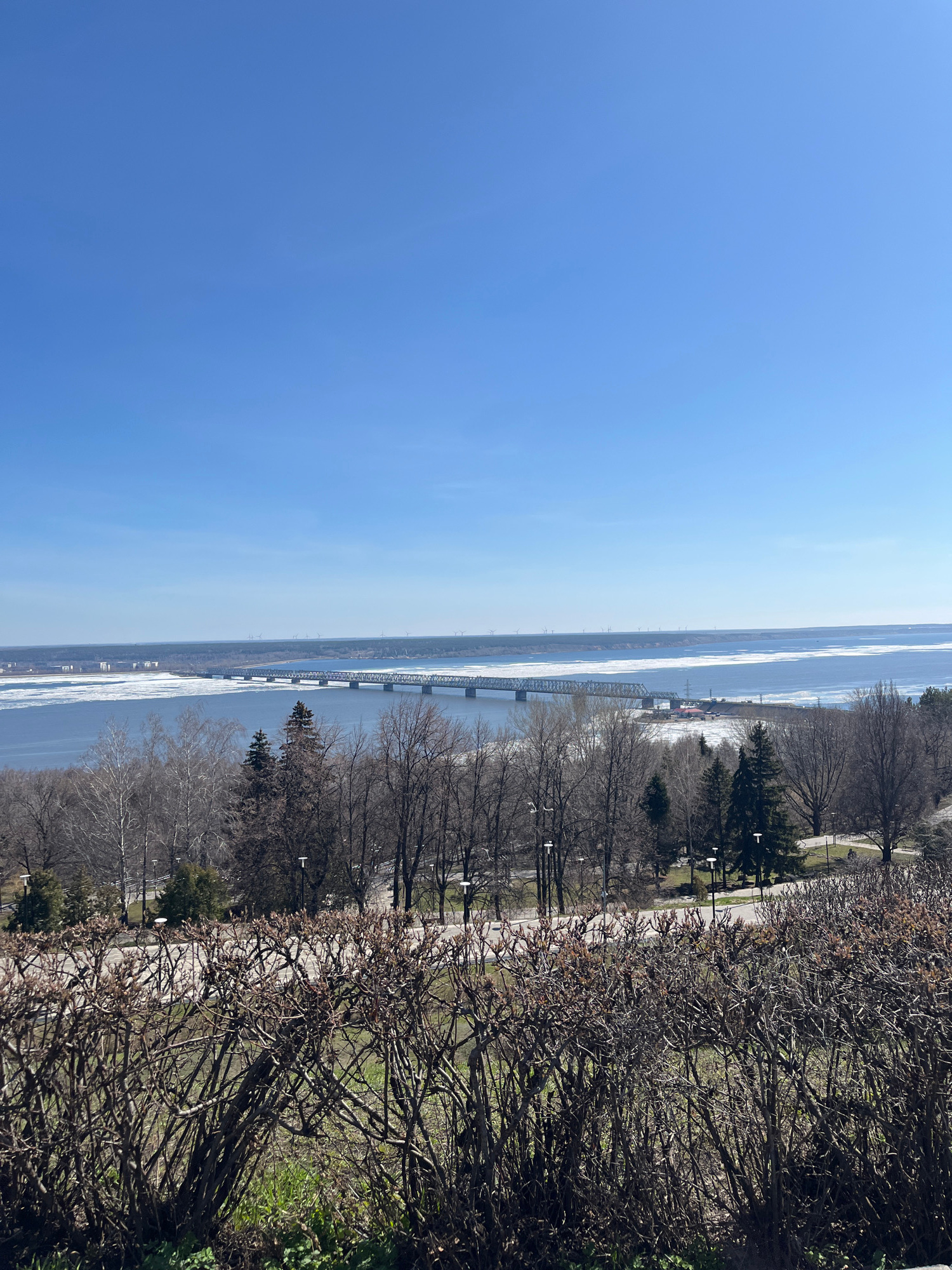 The image shows a high-angle view overlooking the Volga River in Ulyanovsk, Russia. The river is partially frozen, with visible ice floes. A bridge spans the river. Bare trees and some evergreens line…read more