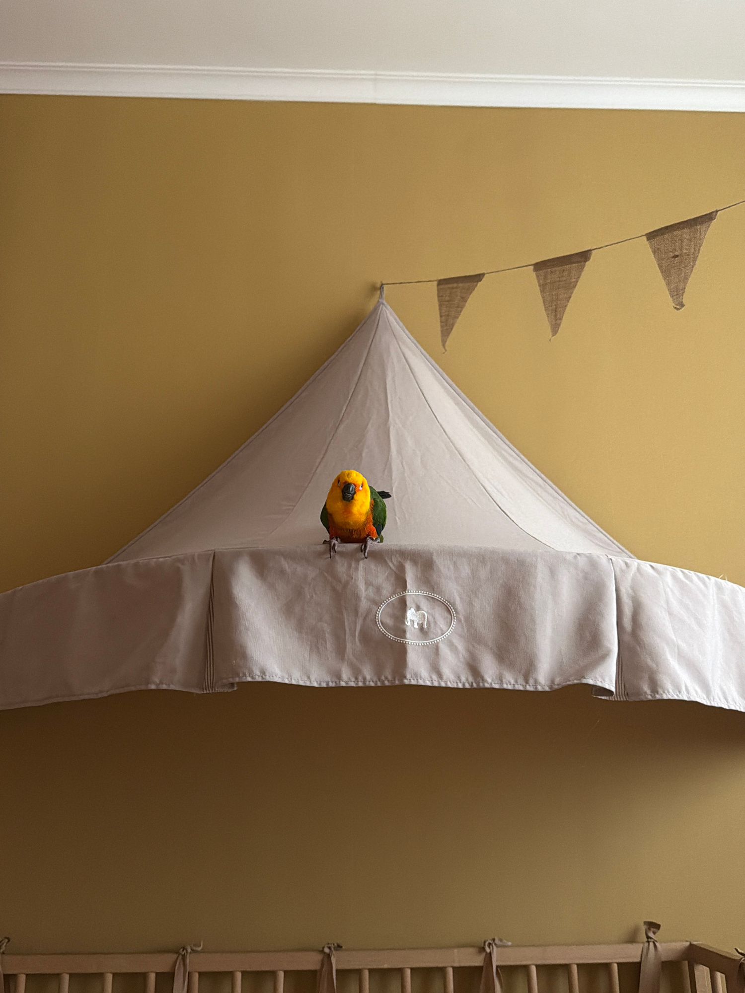 A colorful bird with a yellow head and green and red wings is perched within a triangular off-white fabric structure affixed to a mustard-colored wall. Above the structure, a string of small burlap tr…read more