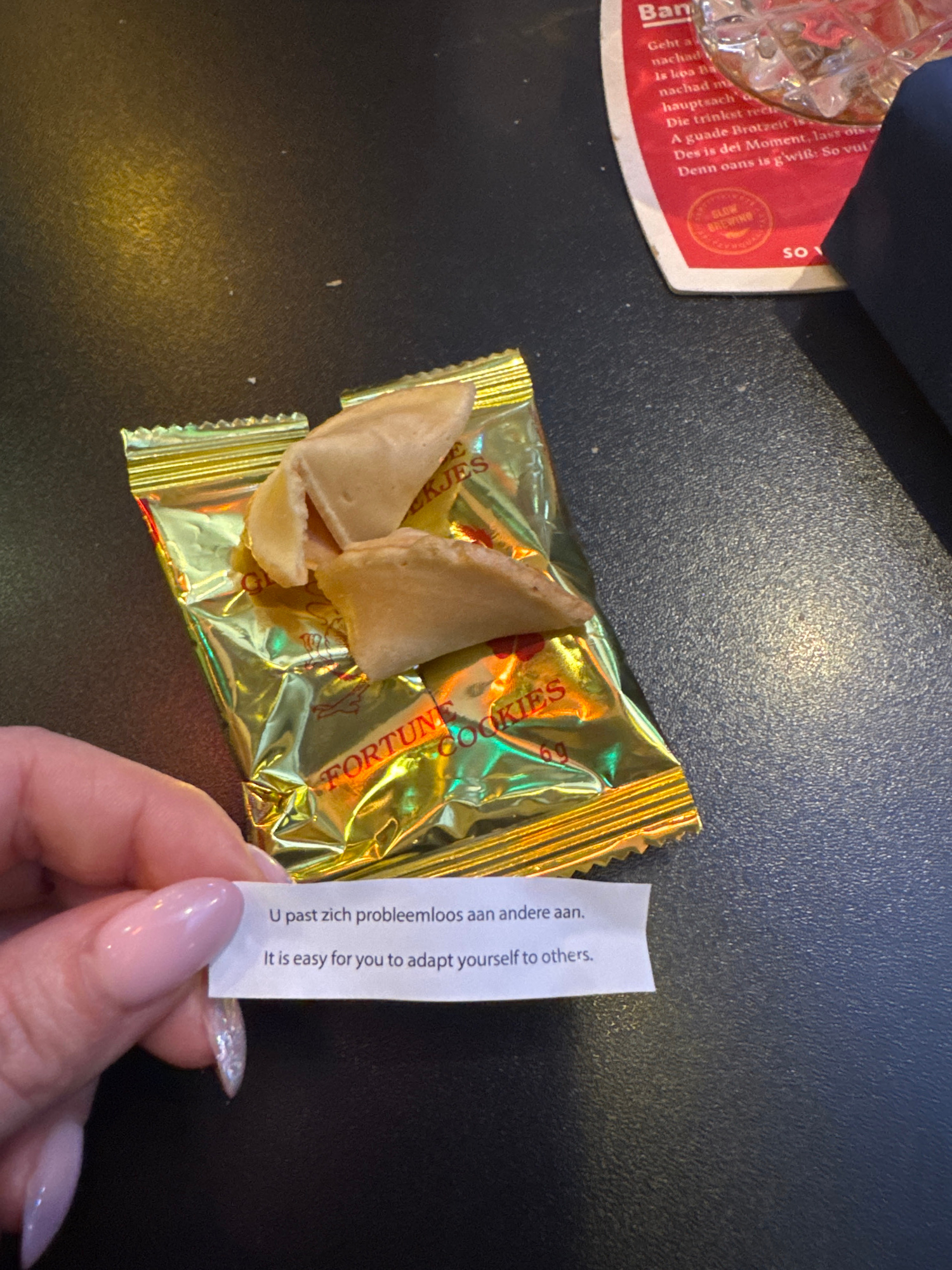 The image shows a gold-colored foil package labeled "FORTUNE COOKIES" partially opened with a broken fortune cookie next to it. A woman is holding the fortune in her hand. The fortune is written in Du…read more