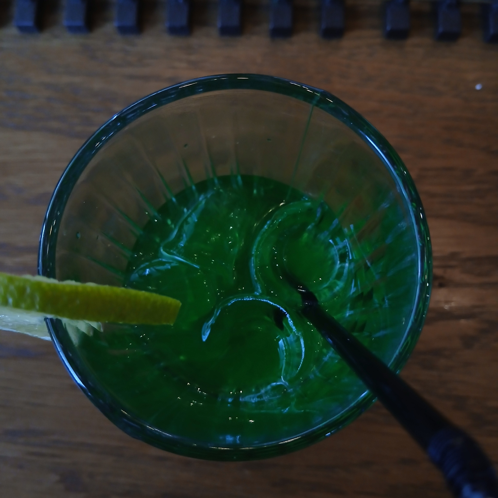 An overhead shot captures a clear glass filled with a vibrant, translucent green beverage. The liquid exhibits swirling patterns and bright reflections on its surface, suggesting movement or the prese…read more