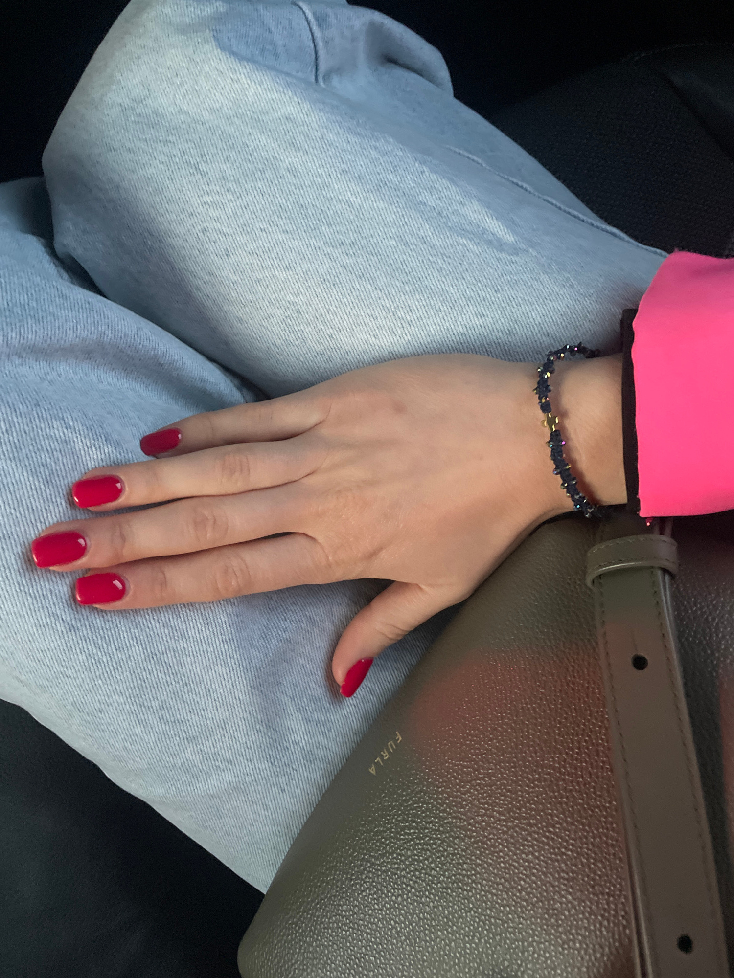A photograph shows a person's hand resting on their leg. The person is wearing light-wash denim jeans and a bright pink top with a black trim. A gray leather bag with a strap is also visible. The pers…read more