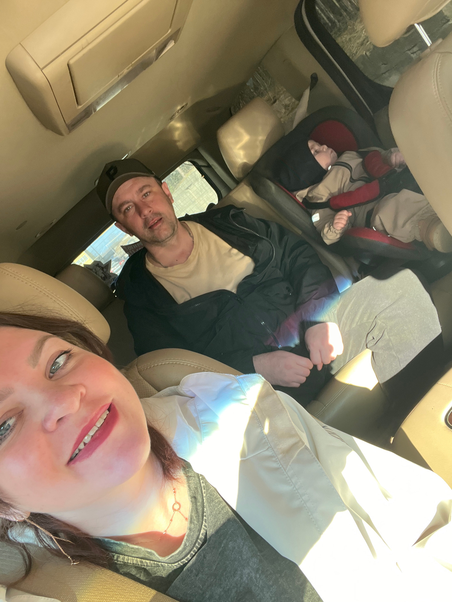 This media file captures a family inside a car, likely traveling, in Noviy, Russia. The image is taken as a selfie, rotated horizontally, giving a unique perspective of the vehicle's interior and its…read more