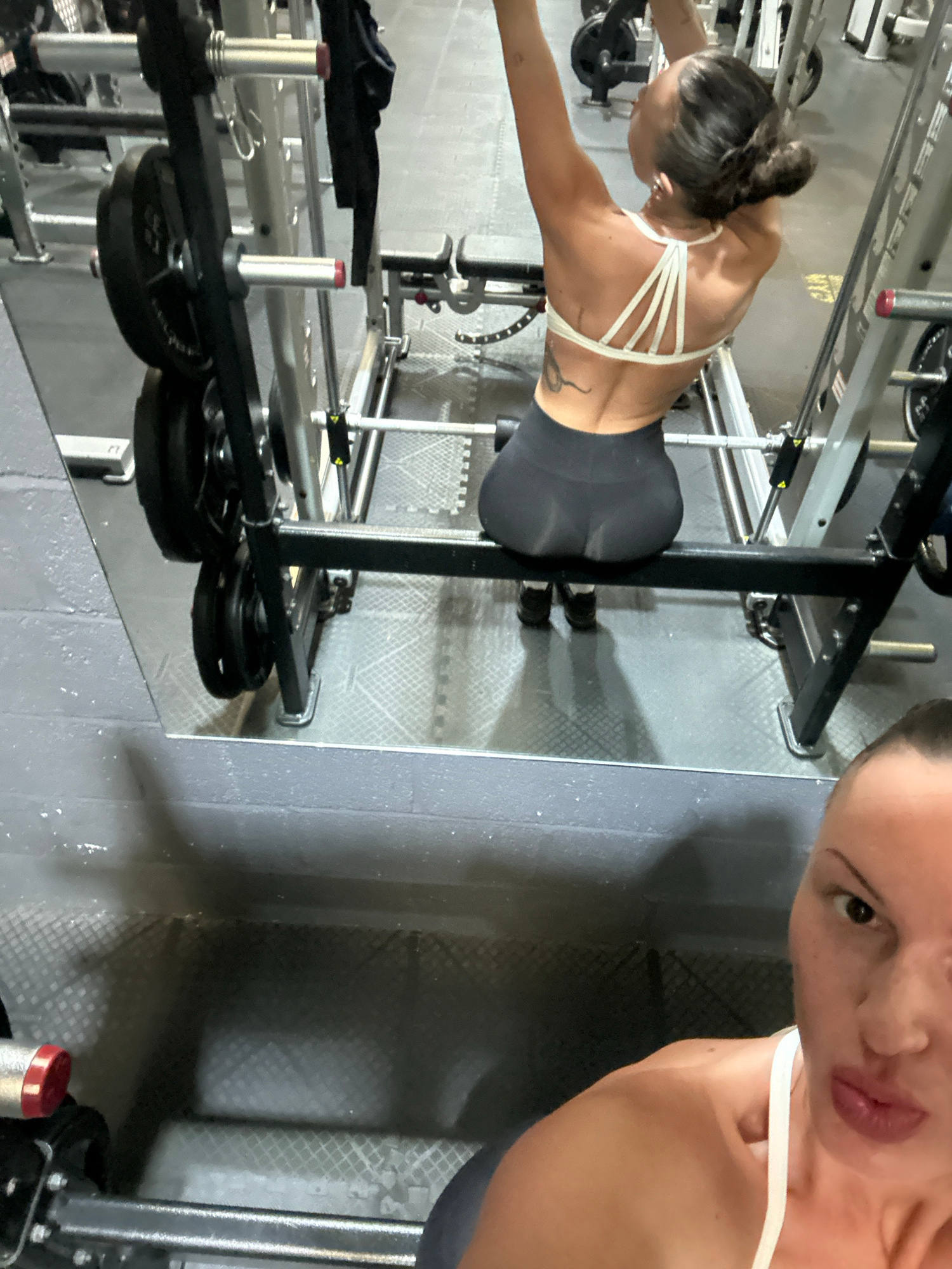 The image depicts two women in a gym setting. One woman is reflected in a mirror, performing a stretching exercise while holding onto a weight rack. She is wearing a sports bra and leggings. The secon…read more