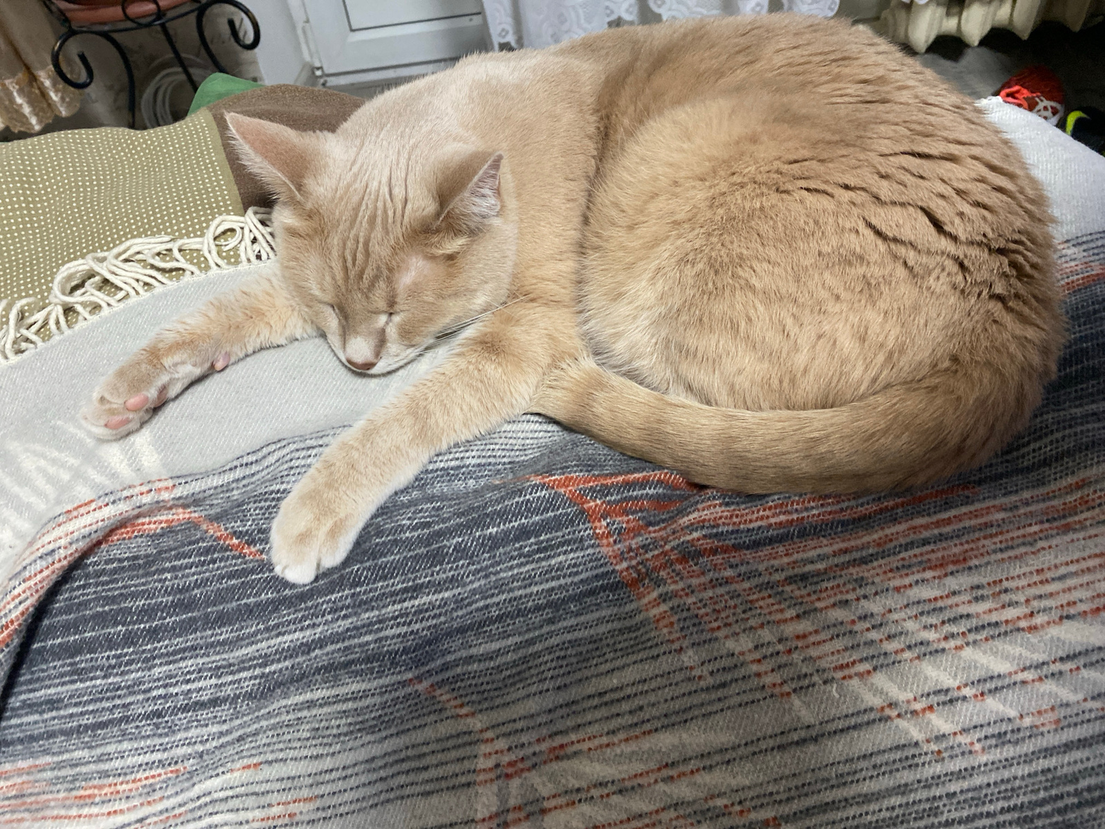 A light-colored cat is depicted sleeping peacefully on a stack of blankets in an indoor setting. The cat, appearing to be a cream, buff, or light ginger color with short fur, is curled up, with its heβ¦read more