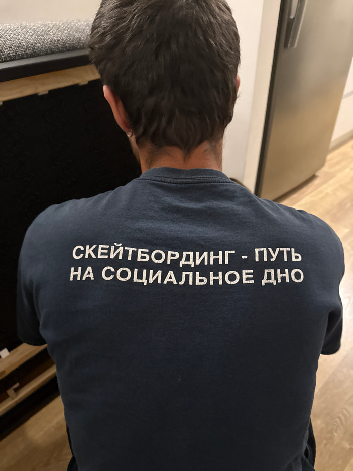 A man's back is visible, wearing a navy blue shirt. White text is printed vertically on the shirt, reading "СКЕЙТБОРДИНГ - ПУТЬ НА СОЦИАЛЬНОЕ ДНО" in Russian. The man has short, dark hair. The backgro…read more