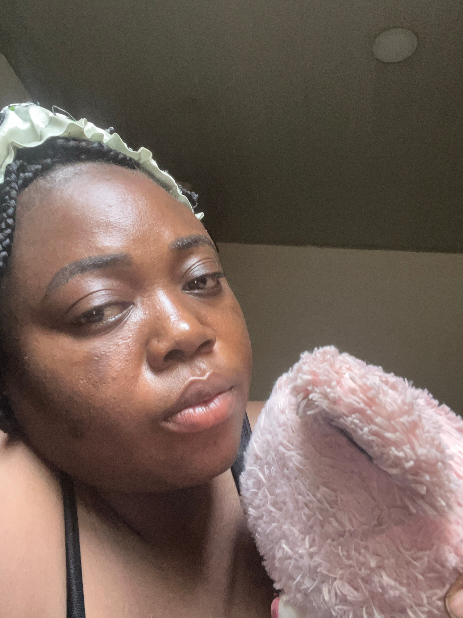 The image presents a close-up portrait of a person, likely a woman, with dark skin and dark braided hair, appearing to be lying down or reclining. Her face is directed towards the camera, showcasing dā¦read more