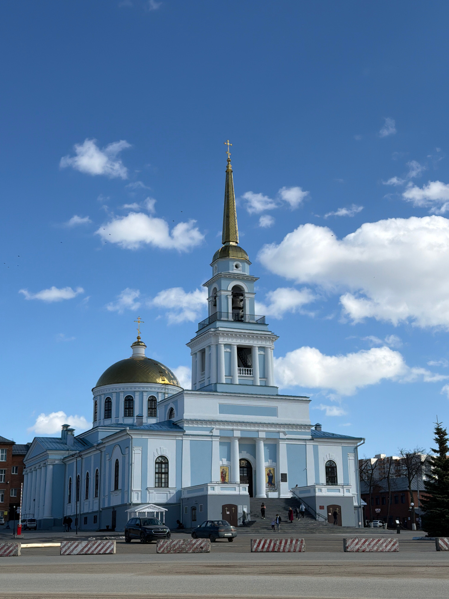 The image depicts the Annunciation Cathedral in Votkinsk, Russia. The church is a light blue and white structure with a gold dome and spire. The sky is blue with white clouds. There are a few people v…read more