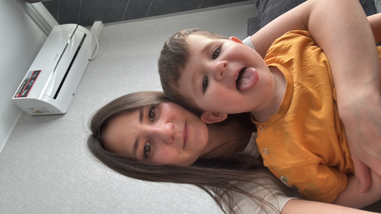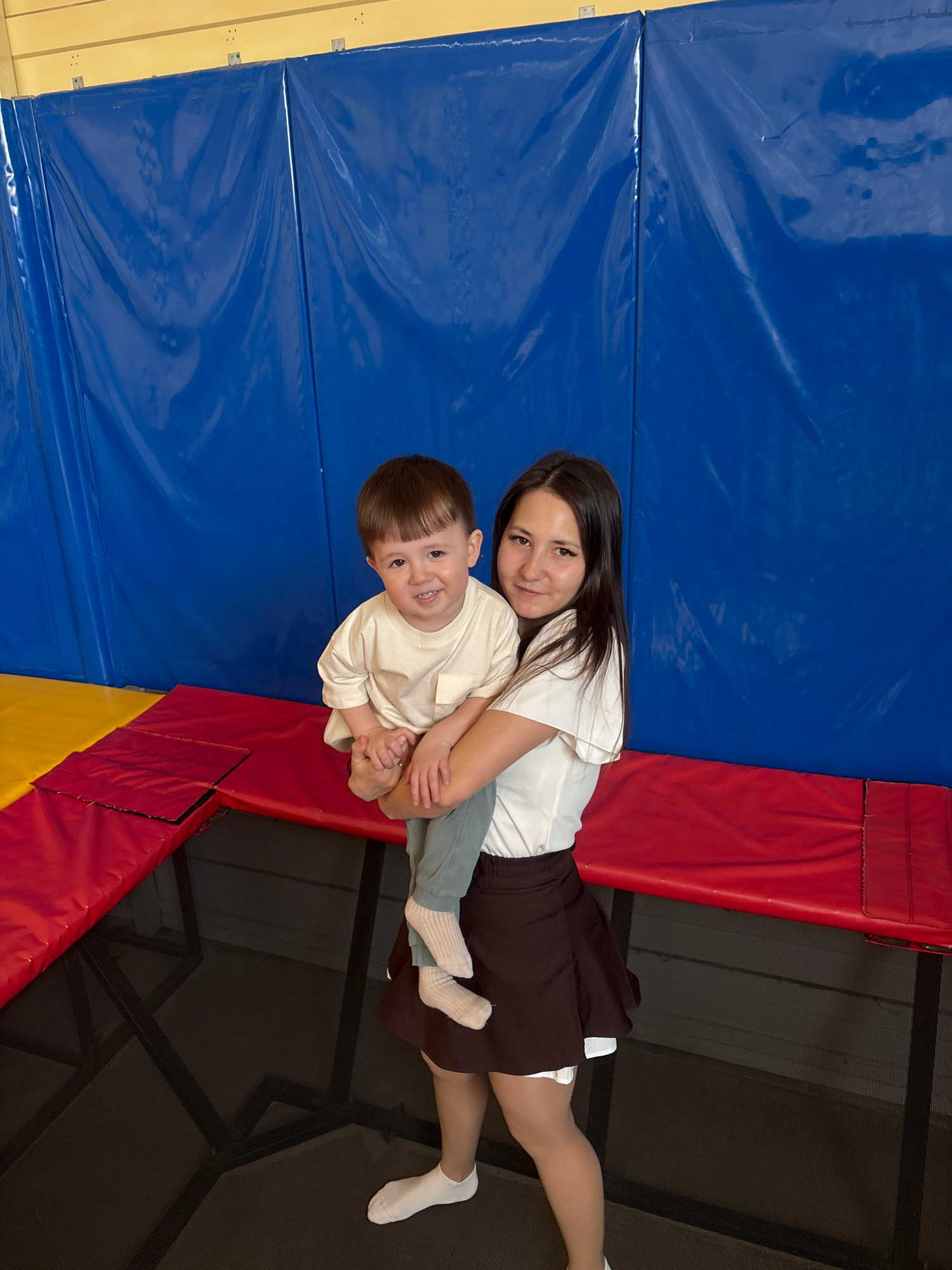The image shows a woman and a young child lying on a trampoline. The woman, with long dark hair, is wearing a white shirt and a dark brown skirt, along with tights and white socks. She has her arms ar…read more