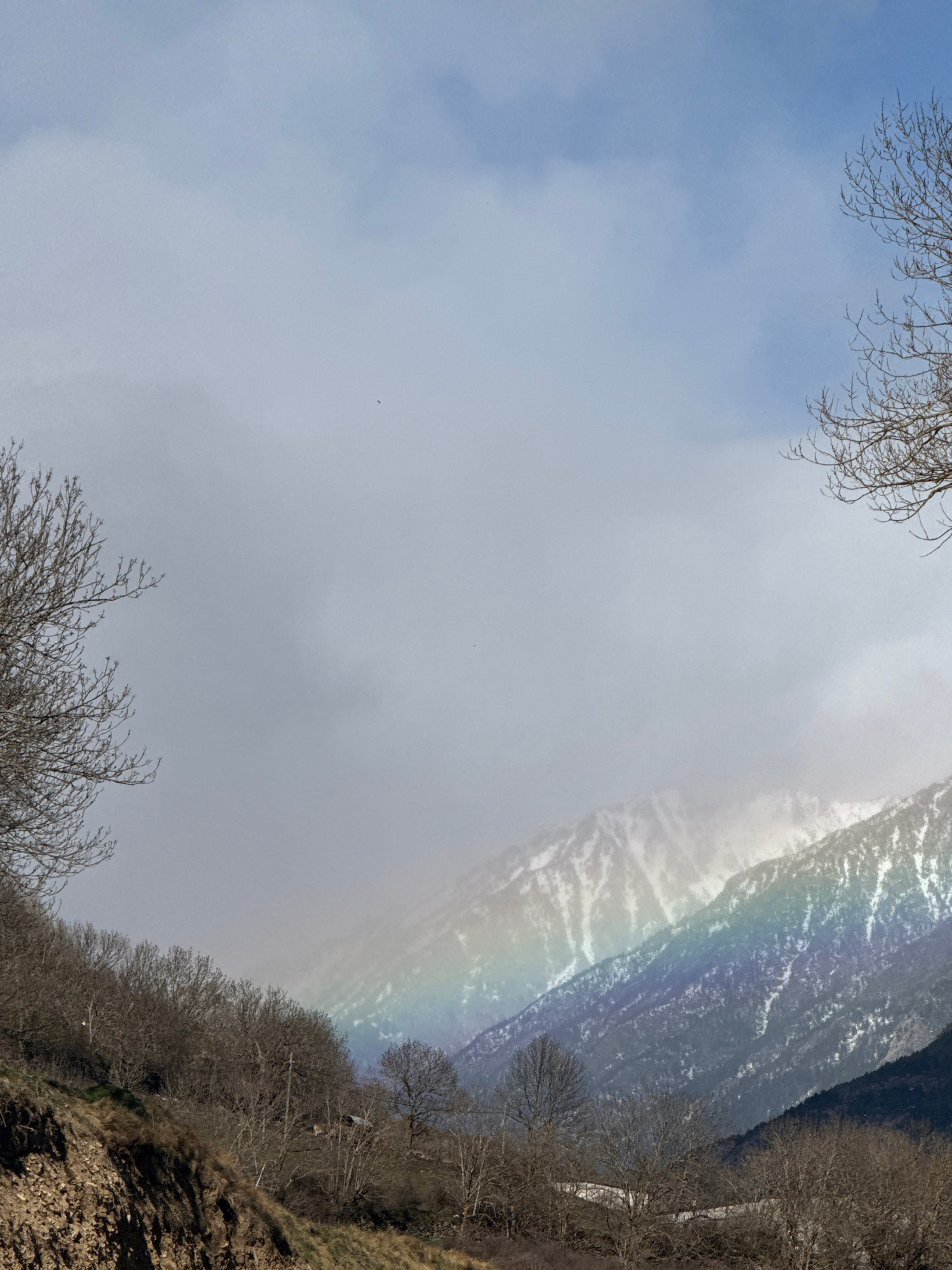 The image is a low-angle shot of a mountain scene in Sahún, Spain. A rainbow appears to the right, over the hillside. The hillside is covered in leafless trees and ground vegetation. The sky is cloudy…read more