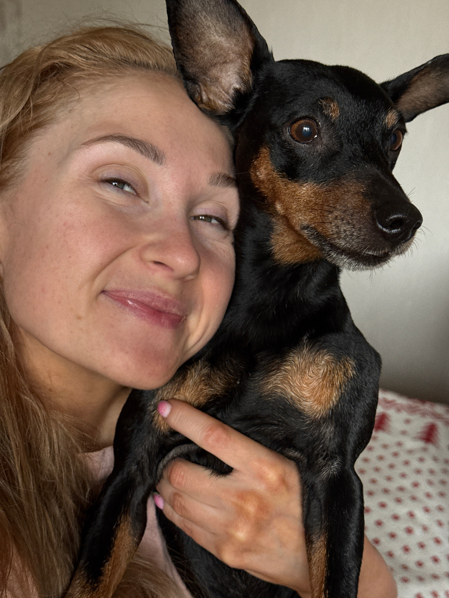A woman with light skin and blonde hair is lying on her back, smiling, while a black and brown dog is lying on top of her. The dog is looking up and to the right. The woman has her right hand on the d…read more