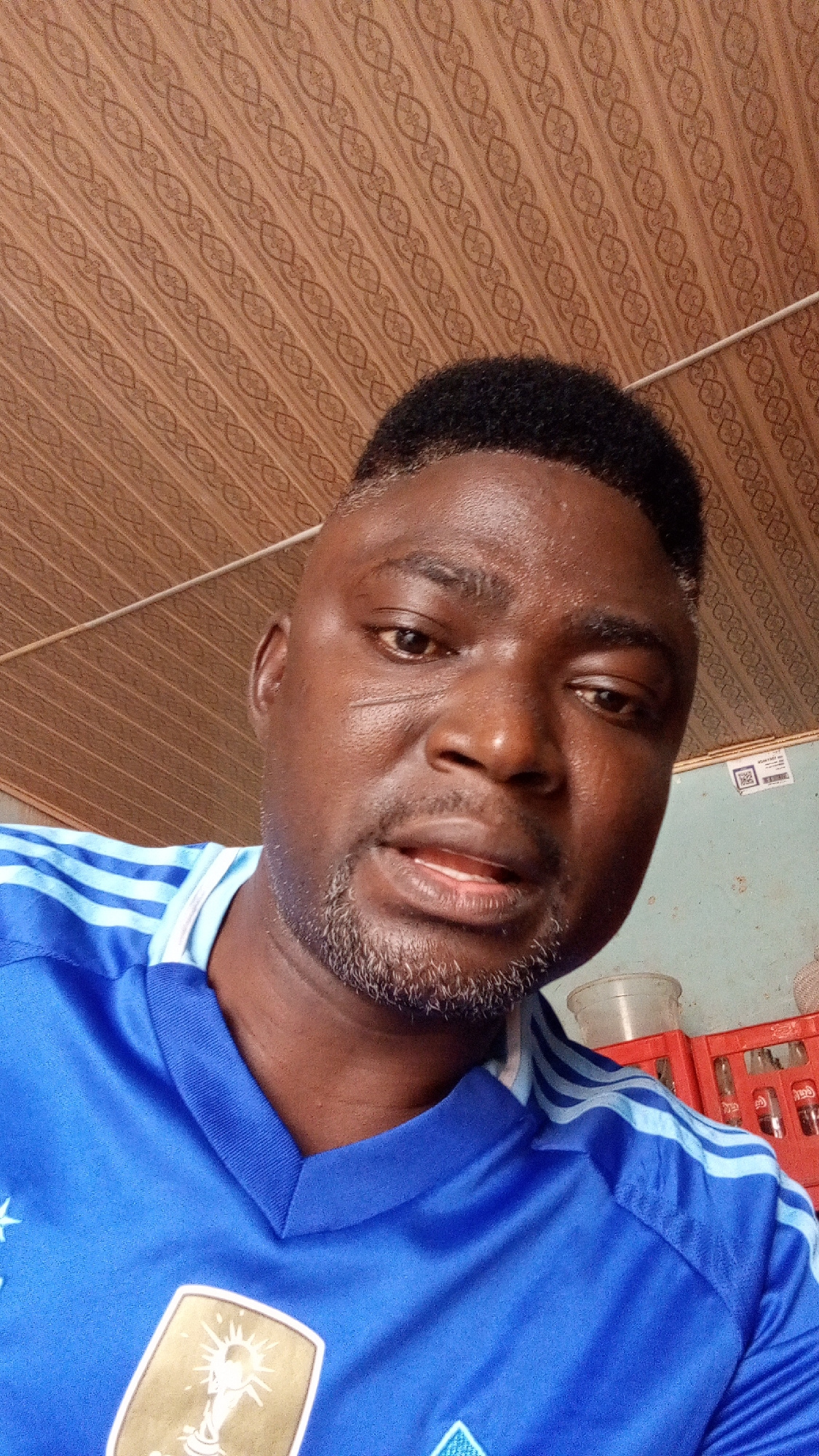 A medium close-up shot captures a man looking directly at the camera. He appears to be of African descent, with dark skin, short curly black hair showing some graying at the temples, and a short, salt…read more
