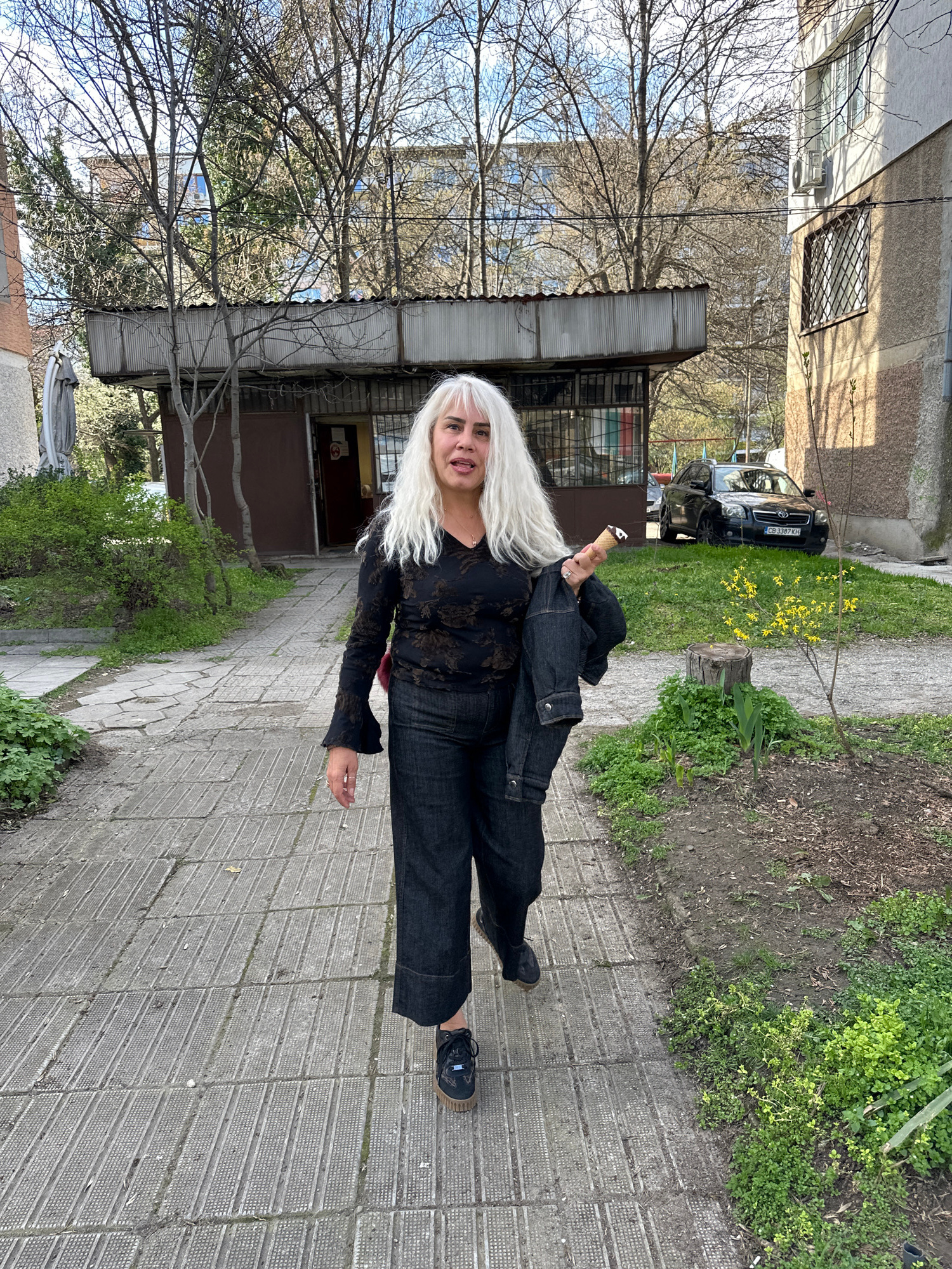 A woman with long white hair is standing on a sidewalk in Sofia, Bulgaria. She is wearing a black blouse, dark denim jacket, and dark denim pants, and black sneakers. She appears to be holding an ice cream cone in her left hand. The sidewalk is made of gray paving stones. To her right is a grassy area with some greenery and a tree stump. Behind her is a small building with a corrugated metal roof and bare trees in the background. Further in the background is a black car and a residential building. | Open Wire