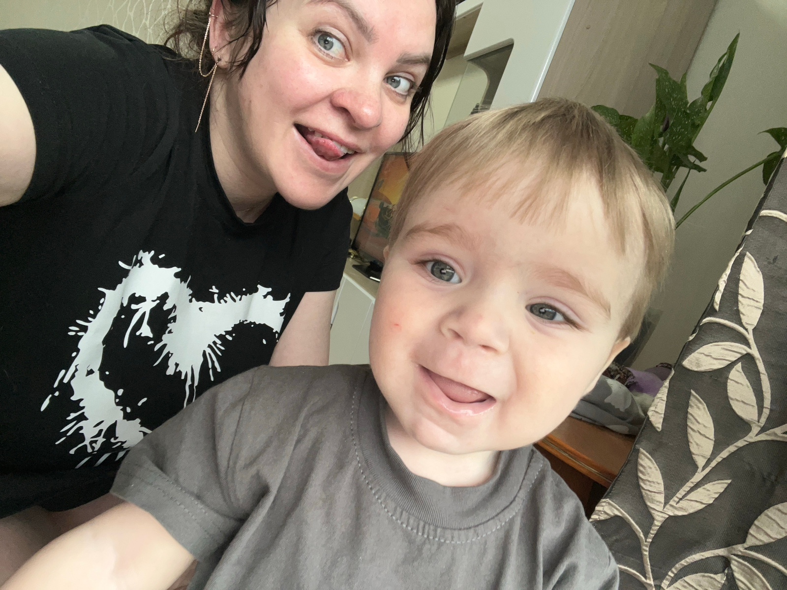 This media file presents a playful, overhead selfie featuring an adult and a young child in an indoor setting. On the left, a young child with light blonde hair, fair skin, and blue-grey eyes looks d…read more