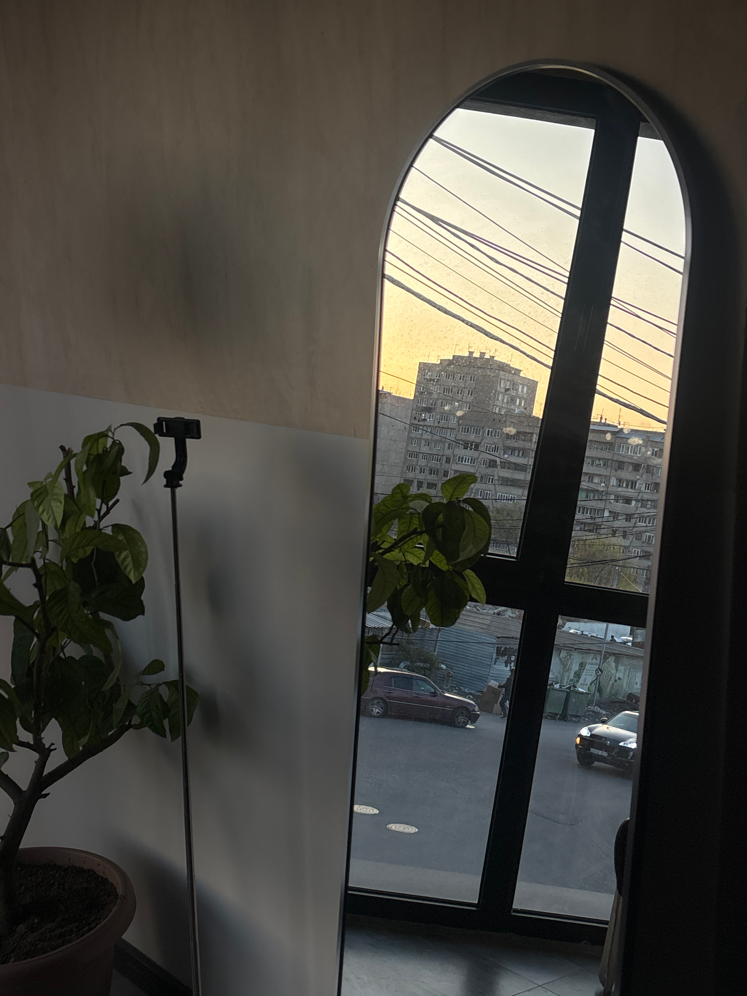 The image shows a view through a curved window in what appears to be a modern building, likely in Yerevan, Armenia, based on the architecture of the buildings visible outside. Outside the window, ther…read more