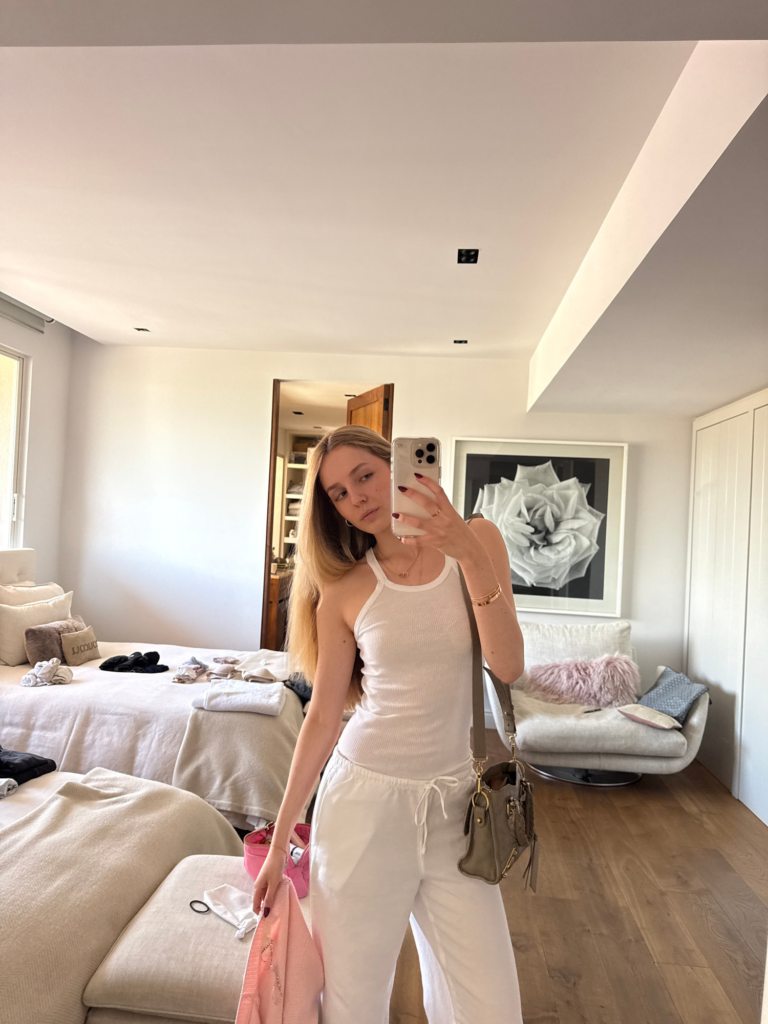 The image depicts a woman taking a mirror selfie inside a well-lit, modern residential bedroom located in Mexico City, Mexico. The woman, with long light-brown hair, is positioned centrally, holding a…read more