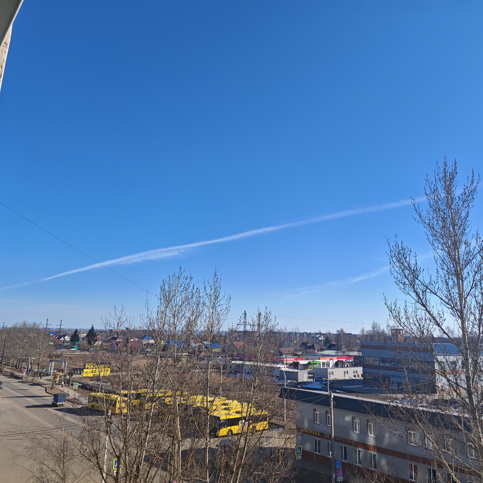 The image depicts a cityscape under a clear blue sky with contrails visible in the upper portion of the frame. In the middle ground, there are buildings of varying heights and architectural styles, in…read more