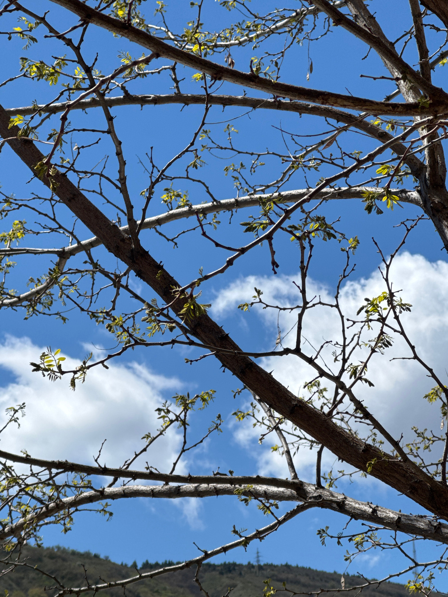 The image shows tree branches with budding leaves against a backdrop of blue sky with scattered white clouds. The branches are bare except for the emerging green leaves. In the background, there are h…read more