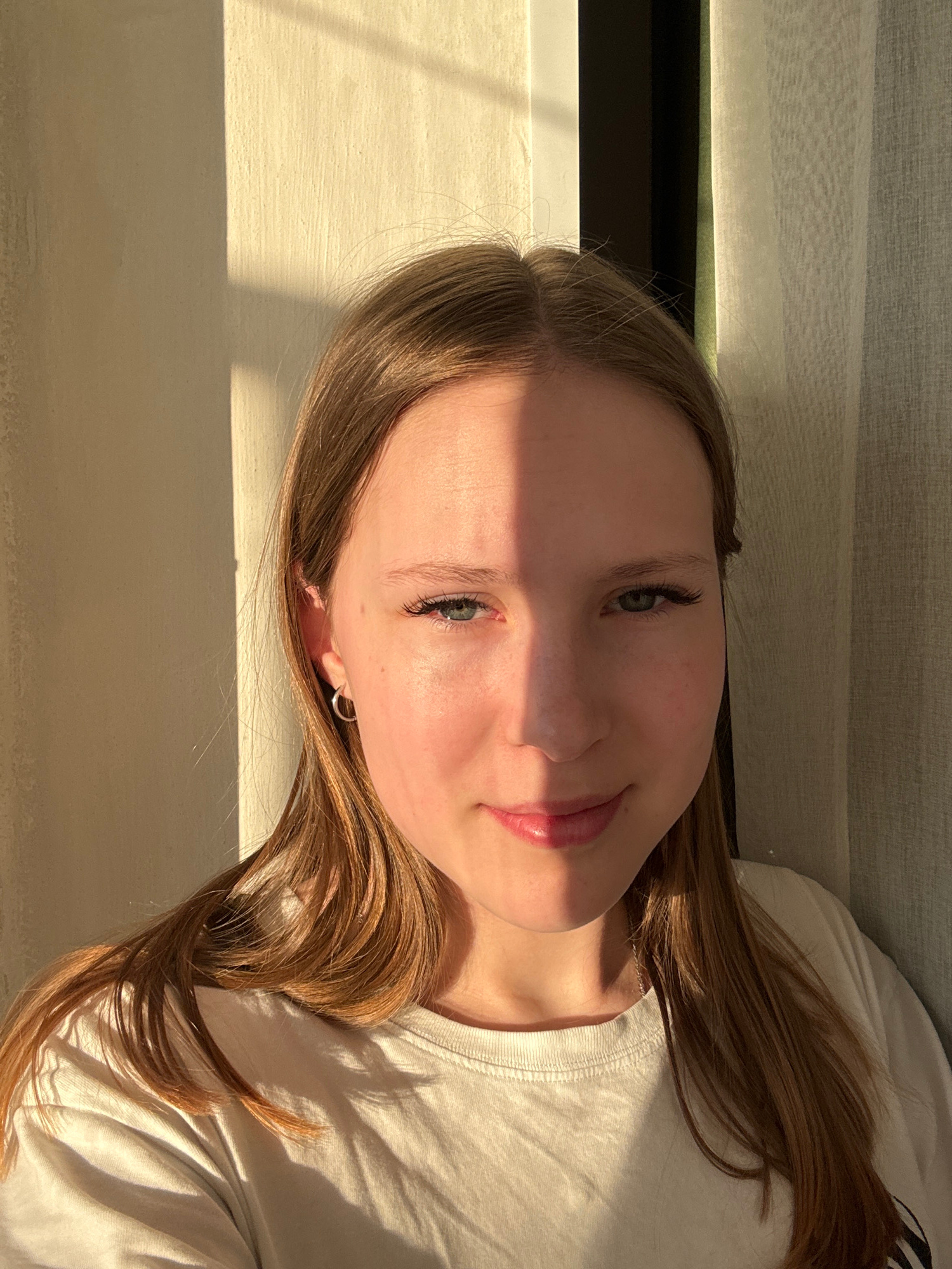 A close-up portrait shows a young individual with long, light brown hair, light skin, and blue-green eyes. The subject is positioned as if lying down or reclining, with their head tilted, looking dire…read more