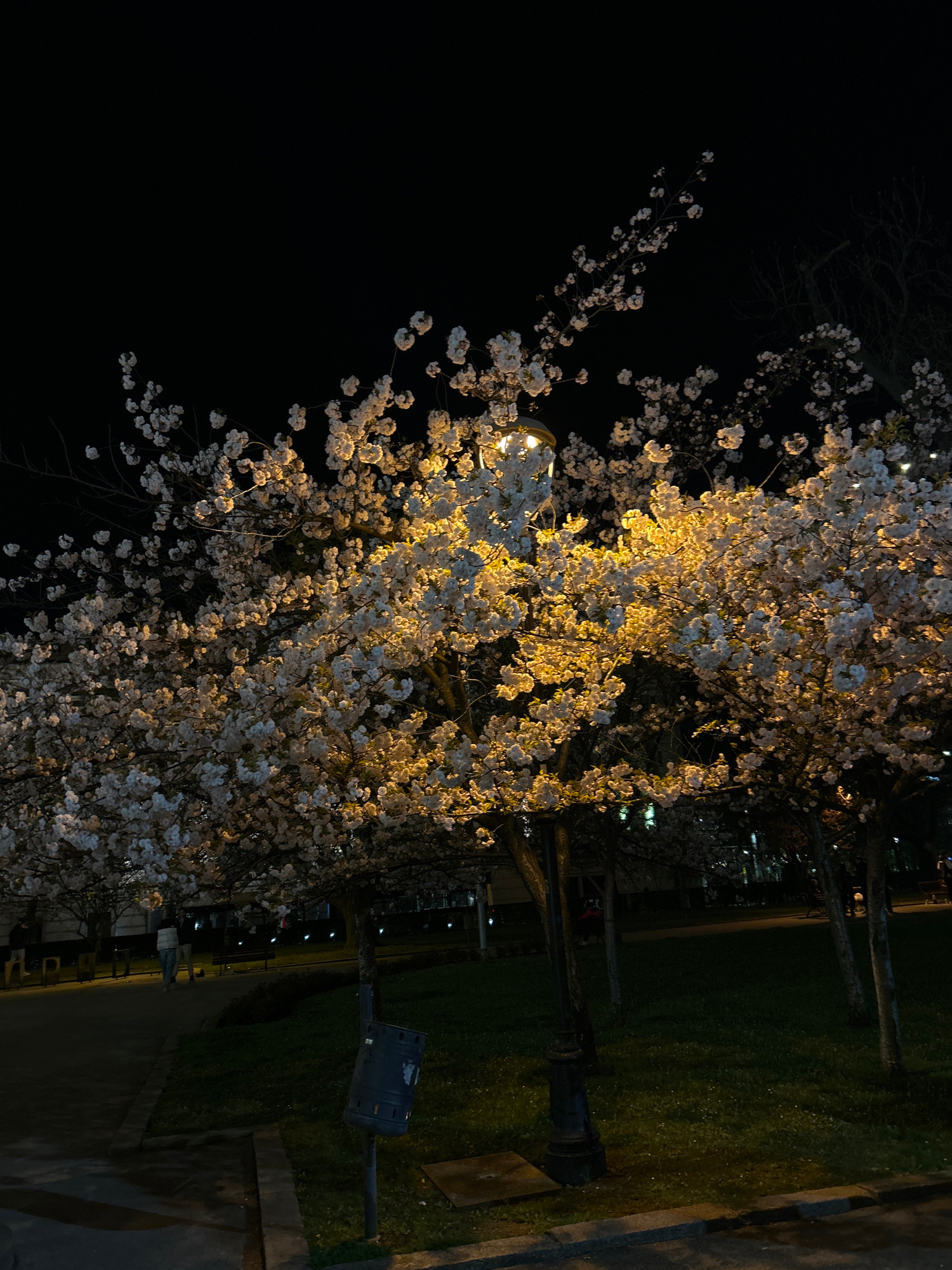 A night-time outdoor scene, likely in a park or urban green space, in Sofia, Bulgaria, features a tree in full bloom. A large tree covered in dense white blossoms dominates the left and central parts…read more