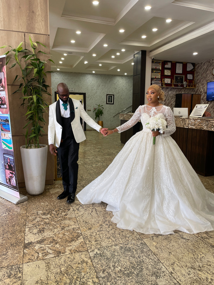 The scene depicts an indoor public space, likely a hotel lobby or event venue, located in Barakin Lerawi, Nigeria. Two individuals, a male and a female, stand centrally, holding hands. The male, with…read more