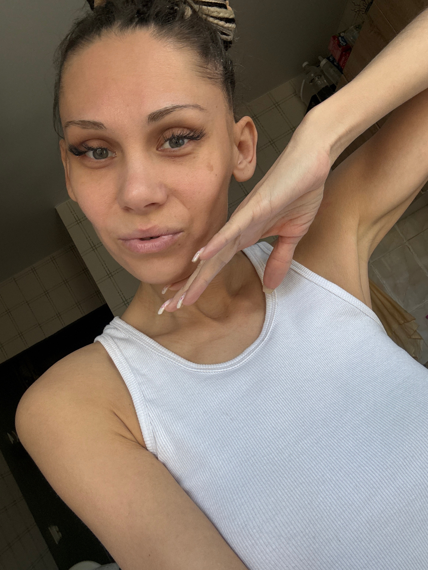 A fair-skinned woman with dark hair pulled back is positioned at an angle, wearing a white ribbed tank top. She has fair skin, dark eyebrows, and long eyelashes. Her left hand is raised with fingers eā¦read more