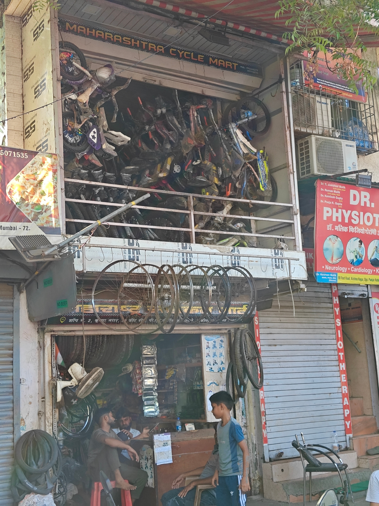 The image depicts the exterior of "Maharashtra Cycle Mart," a bicycle shop located in Mumbai, India (indicated by "Mumbai - 72" on a sign). The shop's frontage is densely packed with bicycles, both in…read more
