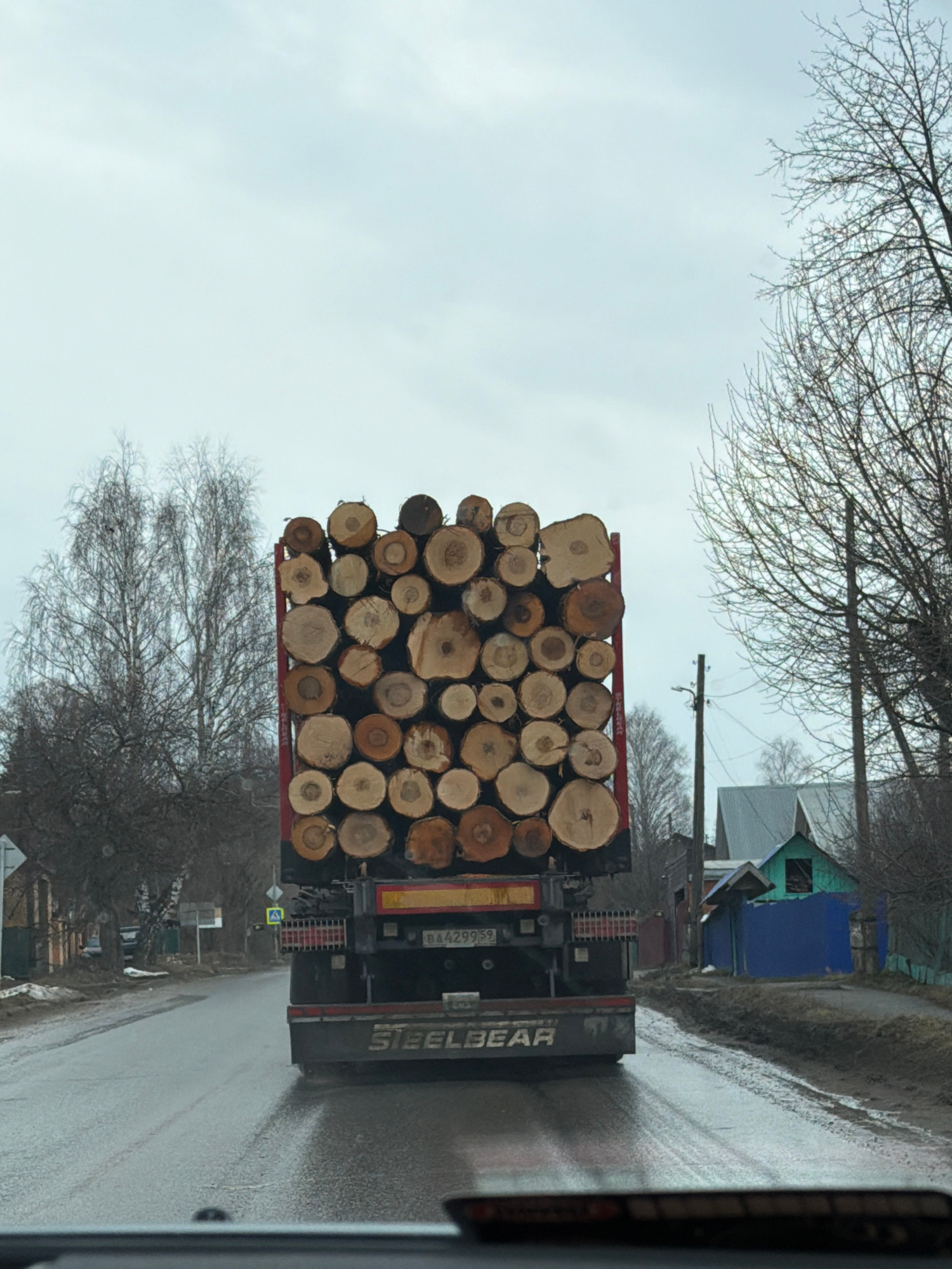 The image shows a truck carrying logs on a road in what appears to be a residential area. The truck is loaded with a large stack of freshly cut logs. The road is wet and appears to be recently paved.…read more