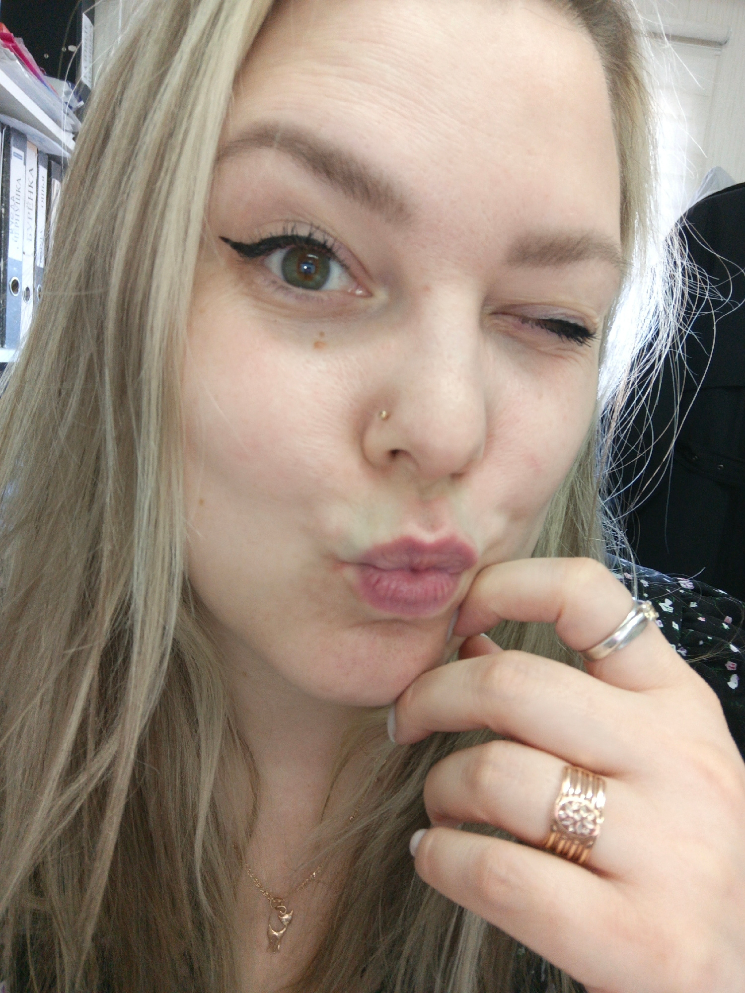 A woman with light blonde hair and fair skin winks at the camera. She has green eyes and is wearing eyeliner. She has a nose piercing and a small gold necklace. She has two rings on her right hand. He…read more