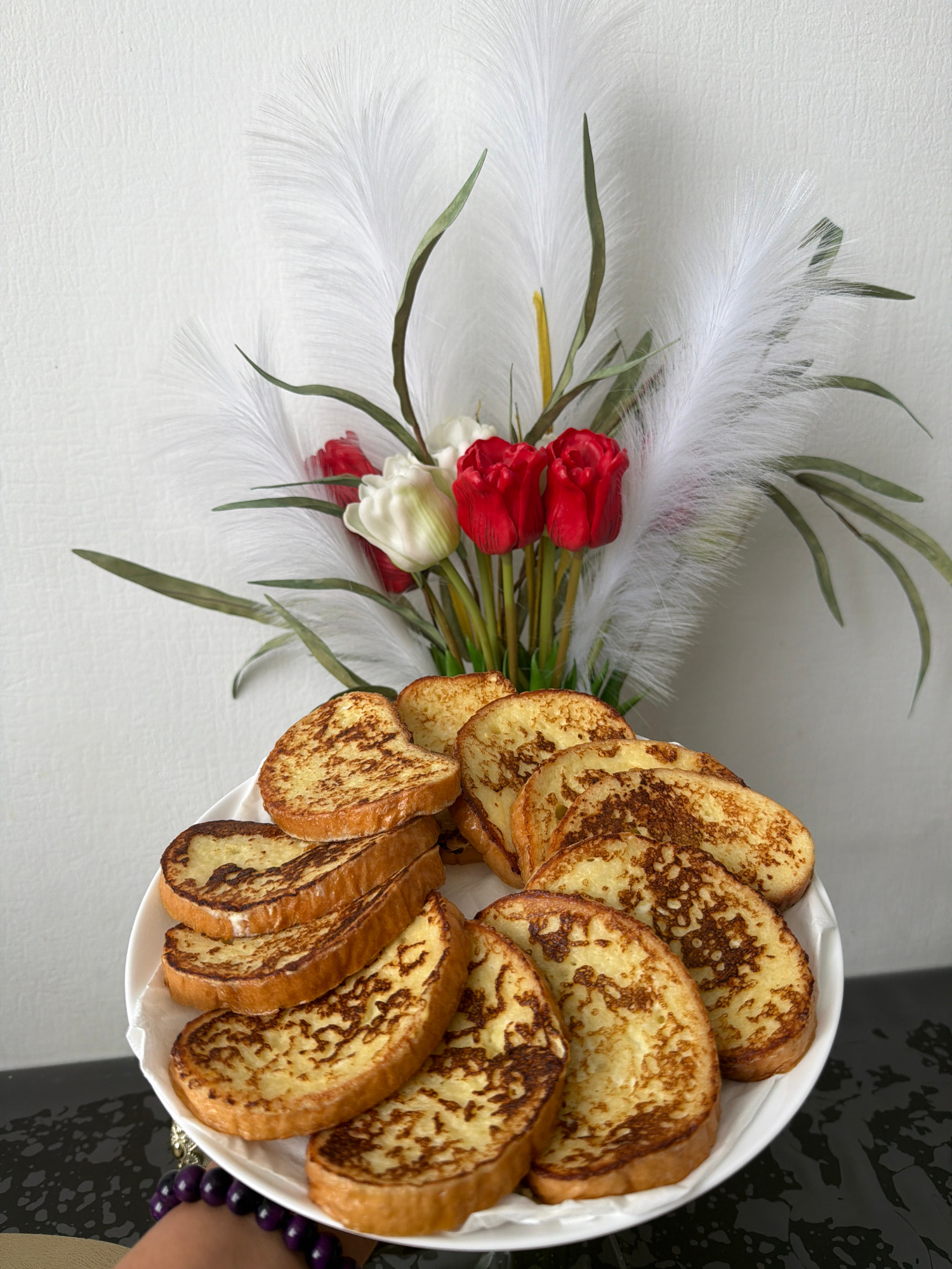 Here's a description of the image: The image shows a plate of what appears to be French toast, arranged in a semi-circle. Next to the plate is a bouquet of red and white tulips, interspersed with fea…read more