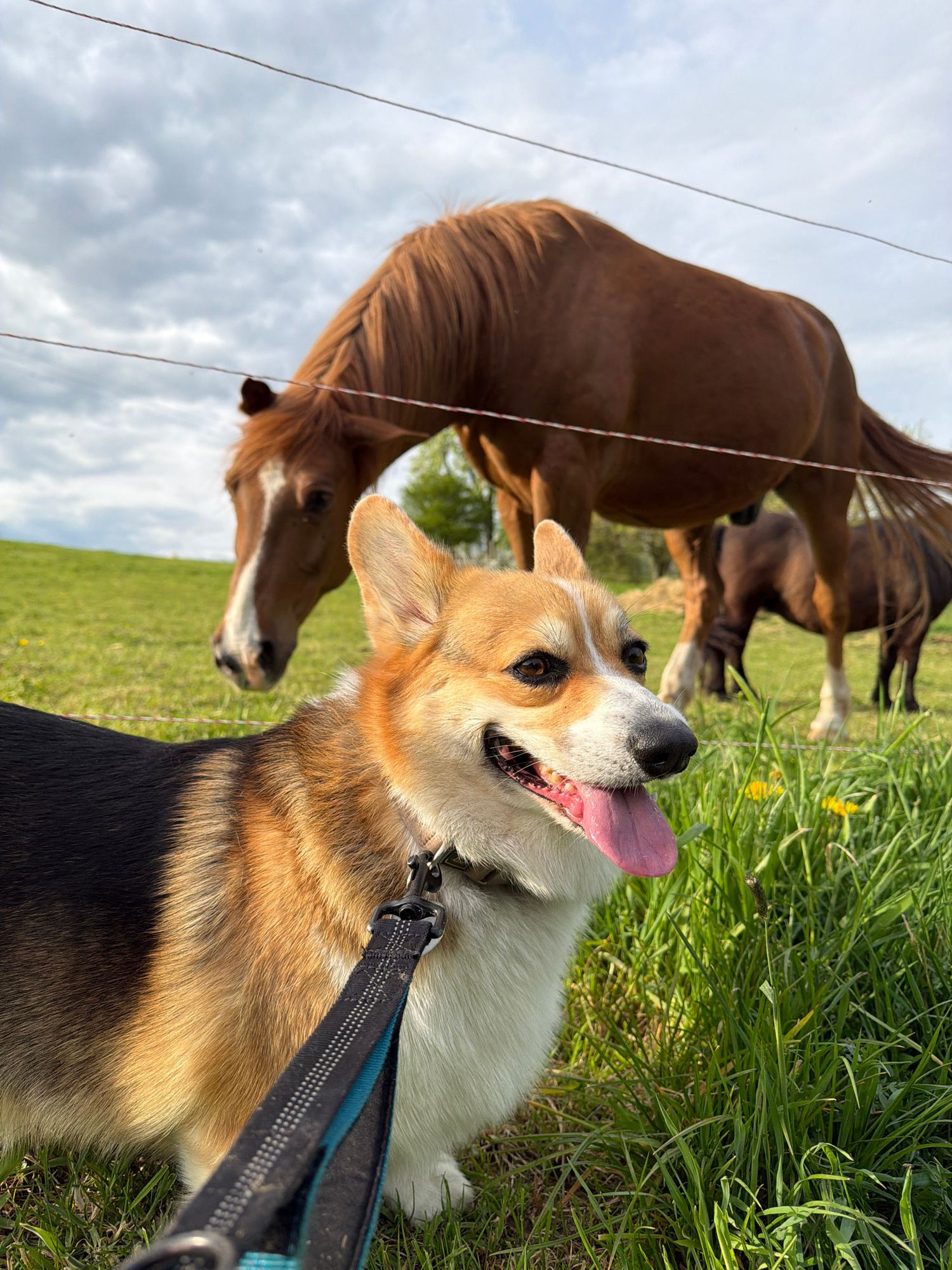 A medium-close shot captures a corgi dog on a leash, panting with its tongue out. The dog is positioned near a field with horses in the background. The location is Gangloff, Germany. A brown horse is…read more
