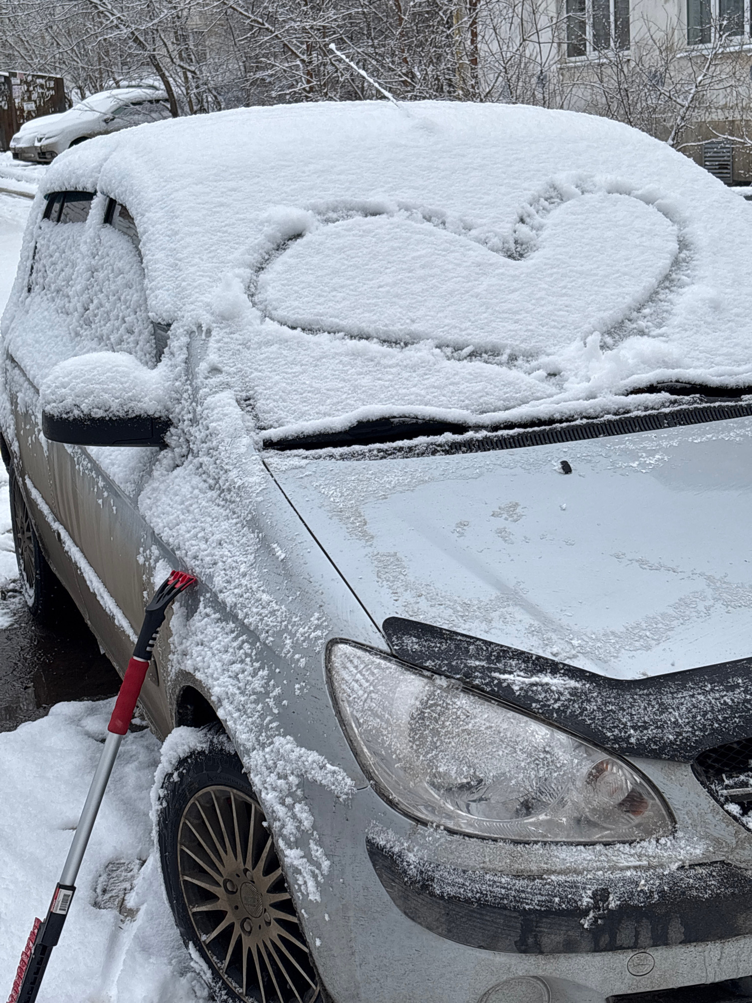The image shows the front of a snow-covered silver car. Someone has drawn a heart in the snow on the hood. A snow brush with a red handle is present near the front tire. The car appears to be parked o…read more