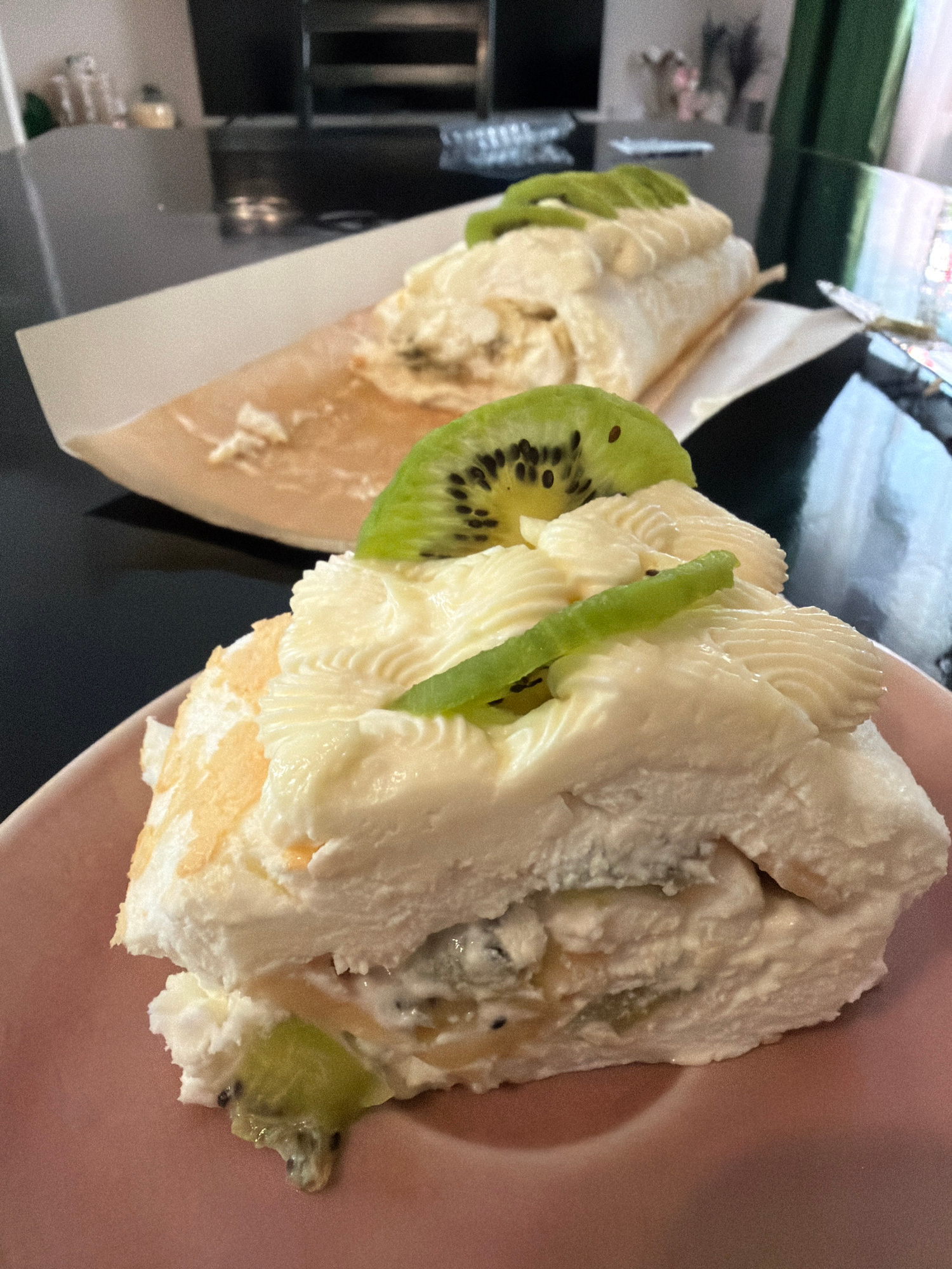 The image shows two servings of dessert, likely cake slices, topped with white frosting and kiwi fruit slices. One slice is presented on parchment paper, while the other is placed on a pink plate. The…read more