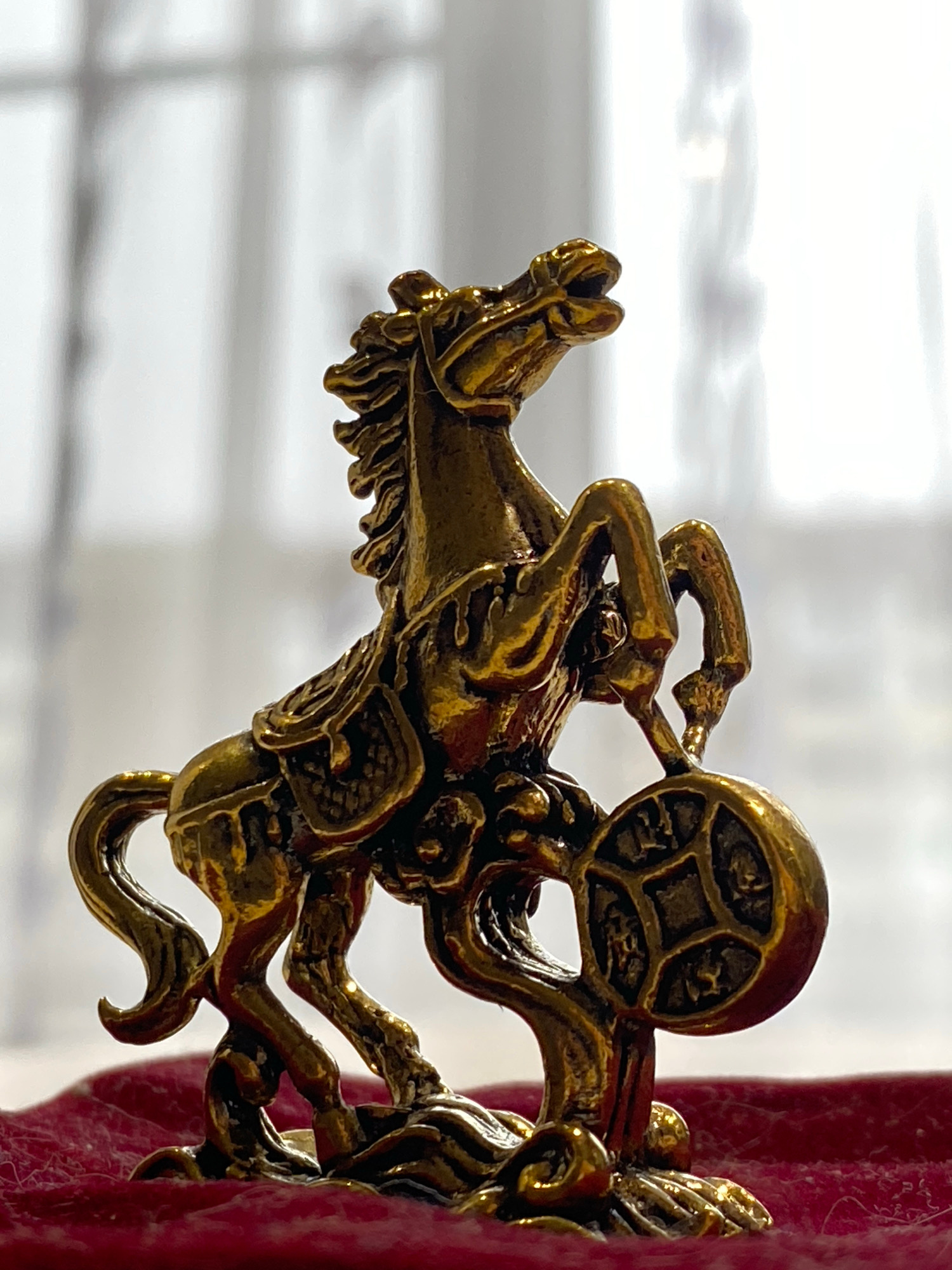 The image displays a close-up of a golden metallic figurine against a bright, blurry background and a textured, deep red surface on the left. The figurine depicts a stylized warrior or deity riding a…read more