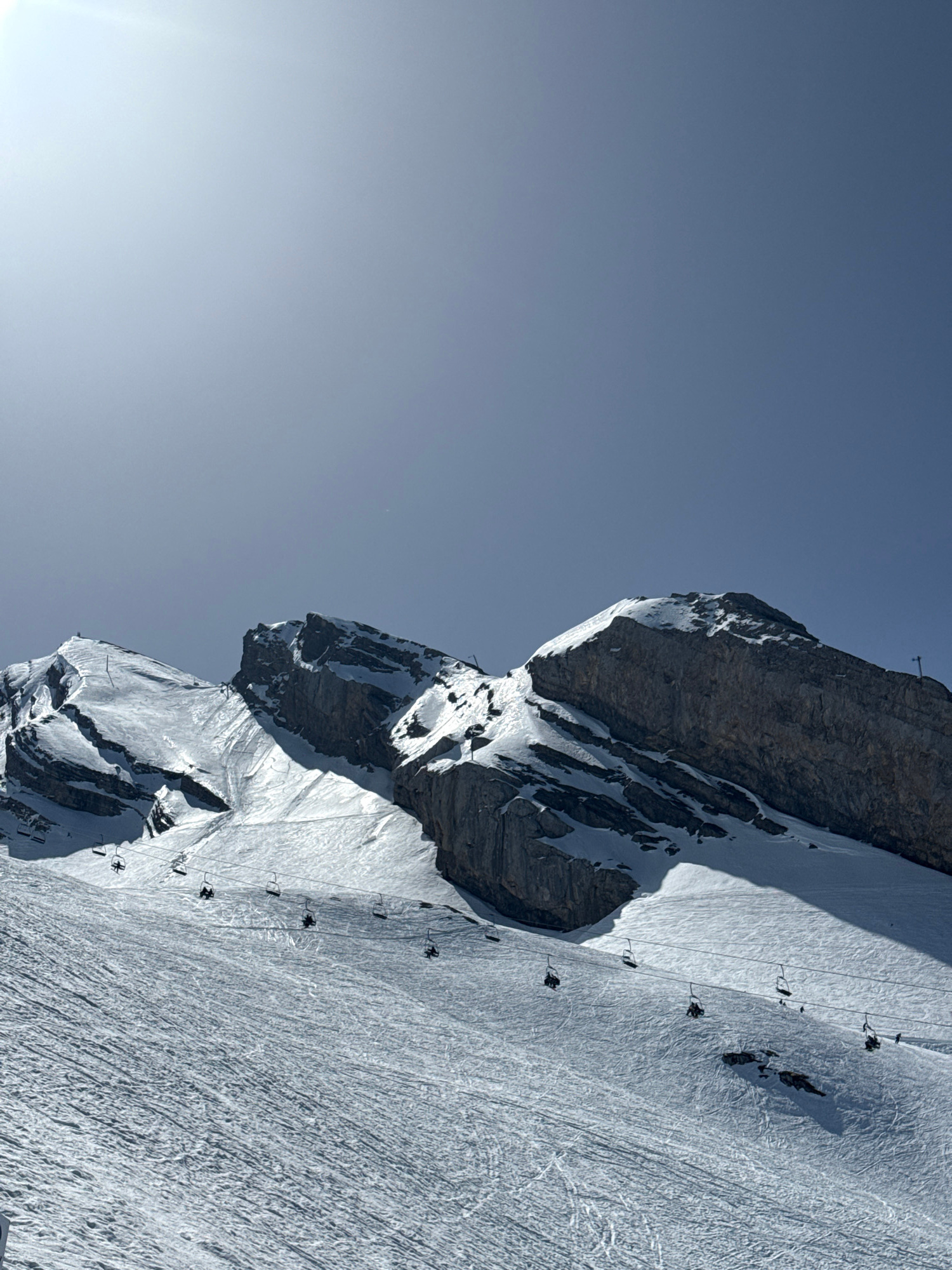 The image depicts a mountainside in La Giettaz, France, featuring a steep, snow-covered slope with visible ski tracks. A rocky cliff face is partially covered in snow and ice. A series of ski lift cha…read more
