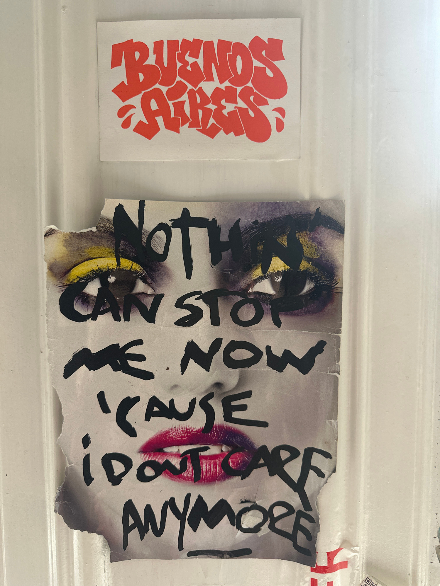 Two stickers are on a white surface. The sticker on the left has orange lettering that reads "BURNS SURFACES". The sticker on the right features a torn image of a face with purple and yellow eye makeu…read more
