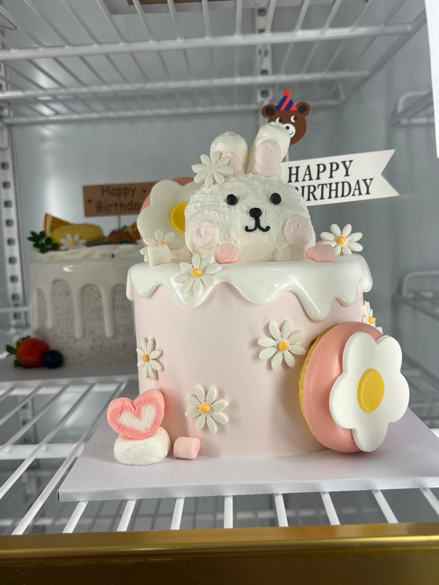 A decorated birthday cake rests on a white surface inside a refrigerator. The cake is adorned with a white bear figurine, daisy-shaped candies, and a donut-shaped topping with a white flower and yello…read more