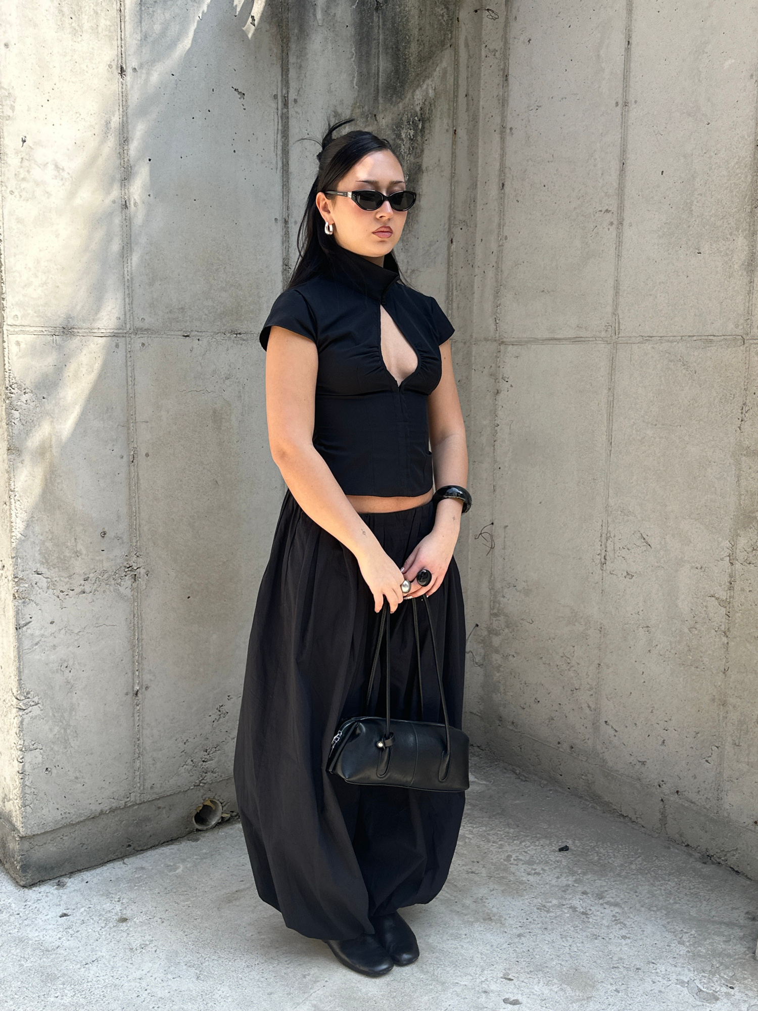 A full-body outdoor portrait depicts a solitary East Asian female subject standing against a textured, light gray concrete wall. The individual, appearing to be in her 20s or 30s, is dressed entirely…read more