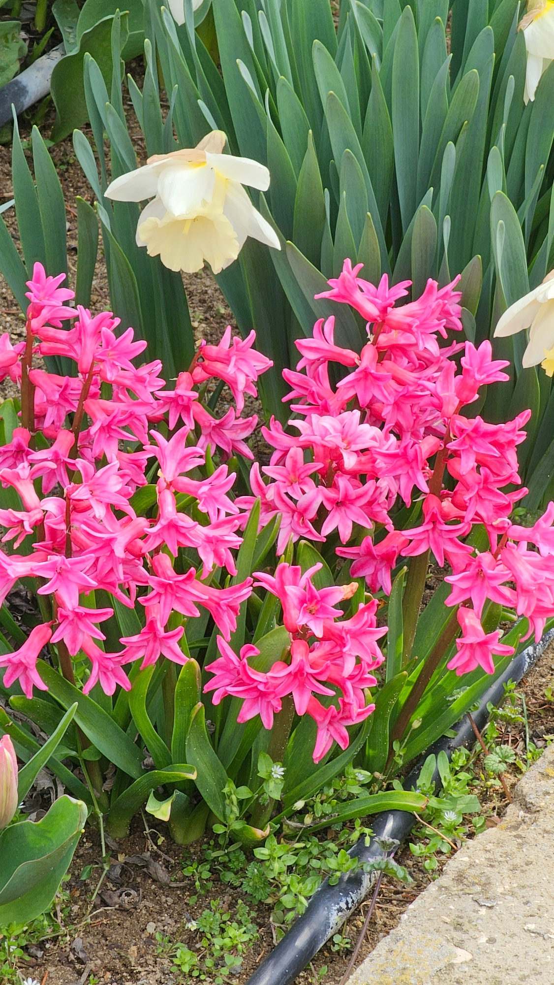 The image presents a close-up view of a garden bed with blooming flowers. The dominant flowers are vibrant pink hyacinths clustered together. To the left, there's a single white and yellow daffodil. T…read more