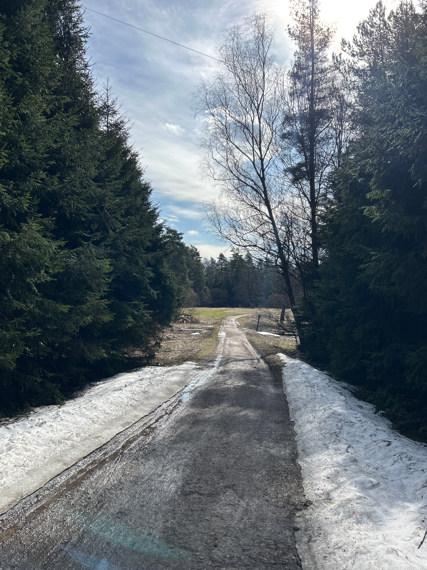 The image shows a narrow, dirt road lined with snow on the right and dense evergreen trees on both sides. In the distance, a green field can be seen. The sky above is partly cloudy with some bare tree…read more