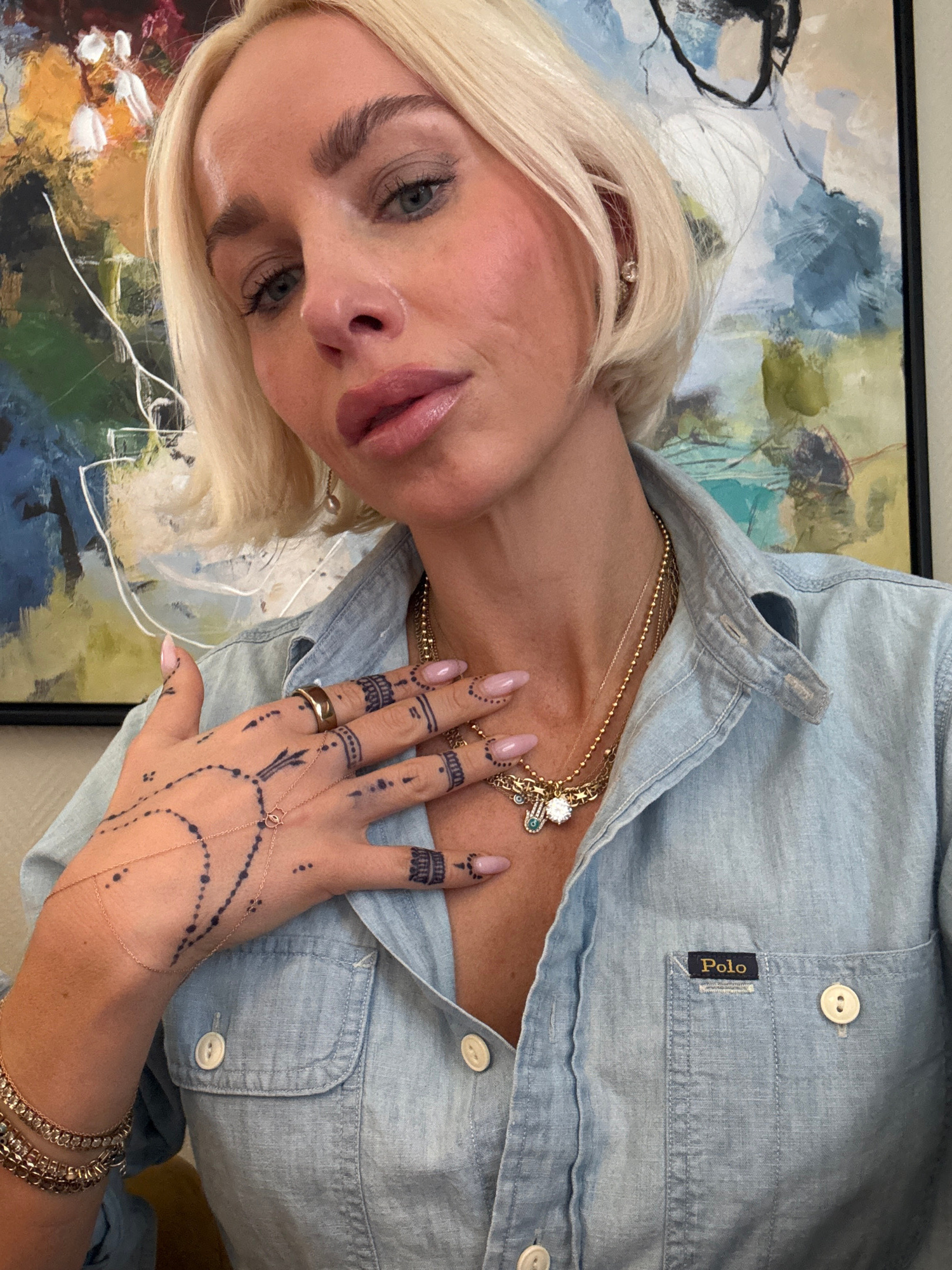 A woman with blonde hair is lying on her side, partially on an abstract painting in a framed black border. She is wearing a light blue button-down shirt, gold necklaces, and a gold bracelet. She has h…read more
